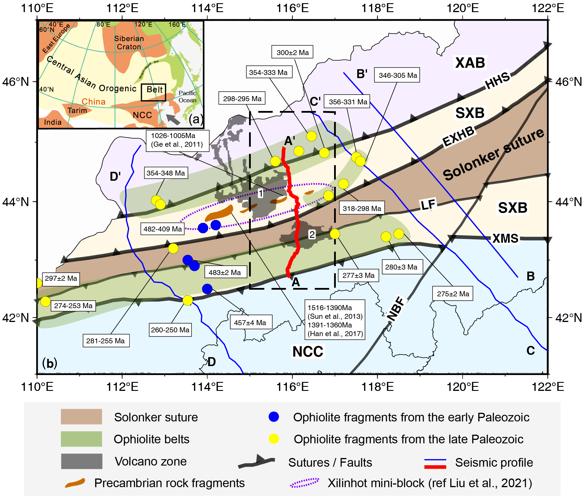 图1 中亚造山带东段地质构造简图(参考Xiao et al., 2018)。(a)为大区域构造简图,(b)为图(a)中黑色框区域。(b)中绿色区域为蛇绿岩带(参考刘永江等, 2019)。AA'-本研究所使用的短周期密集台站;BB'-宽角反射与折射测深剖面(王海燕等, 2022)和深反射地震剖面(Tan et al.,2023, 2024);CC'-宽频带地震台站(Zheng et al., 2015);DD'-深反射地震剖面(Zhang et al., 2014)。NCC-华北克拉通,SXB-松嫩-锡林浩特地块,XAB-兴安地块,XMS-西拉木伦缝合带,LF-林西断层,EXHB-二连浩特-锡林浩特-黑河缝合带,HHS-黑河-贺根山缝合带,1-阿巴嘎火山,2-达里诺尔火山