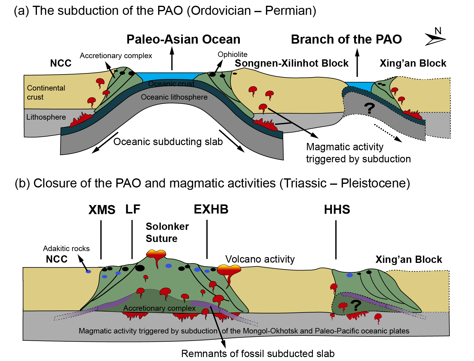 图3 中亚造山带东段构造演化示意图(改自Tan et al., 2024等),问号和虚线表示构造形态和演化过程仍旧需要进一步的研究