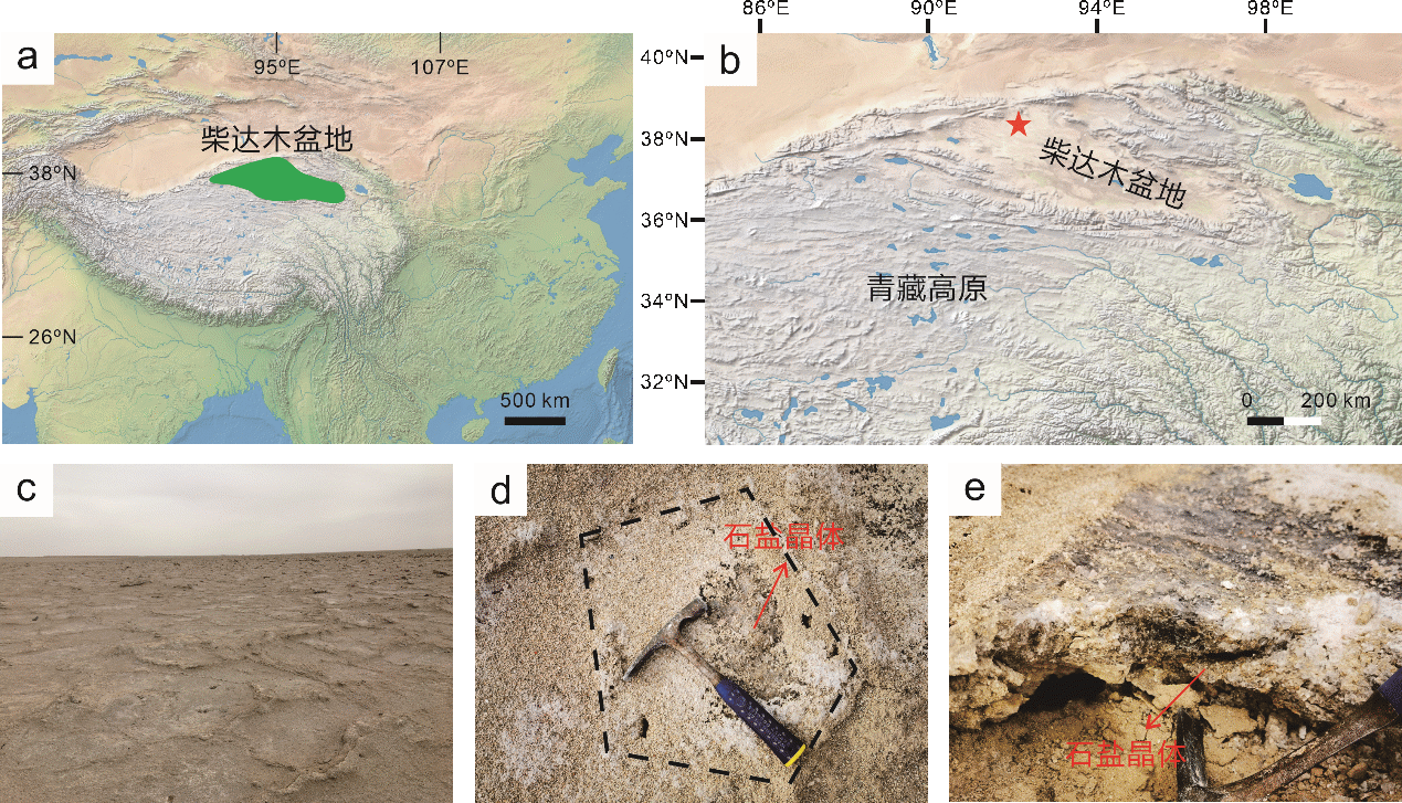 图1 柴达木盆地采样地点。(a) 柴达木盆地在中国西部的位置(绿色区域);(b) 本研究采样区位于柴达木盆地西北部(红色五角星);(c) 采样点的多边形盐壳地貌;(d) 多边形盐壳;(e) 可见新鲜石盐矿物颗粒的盐壳剖面