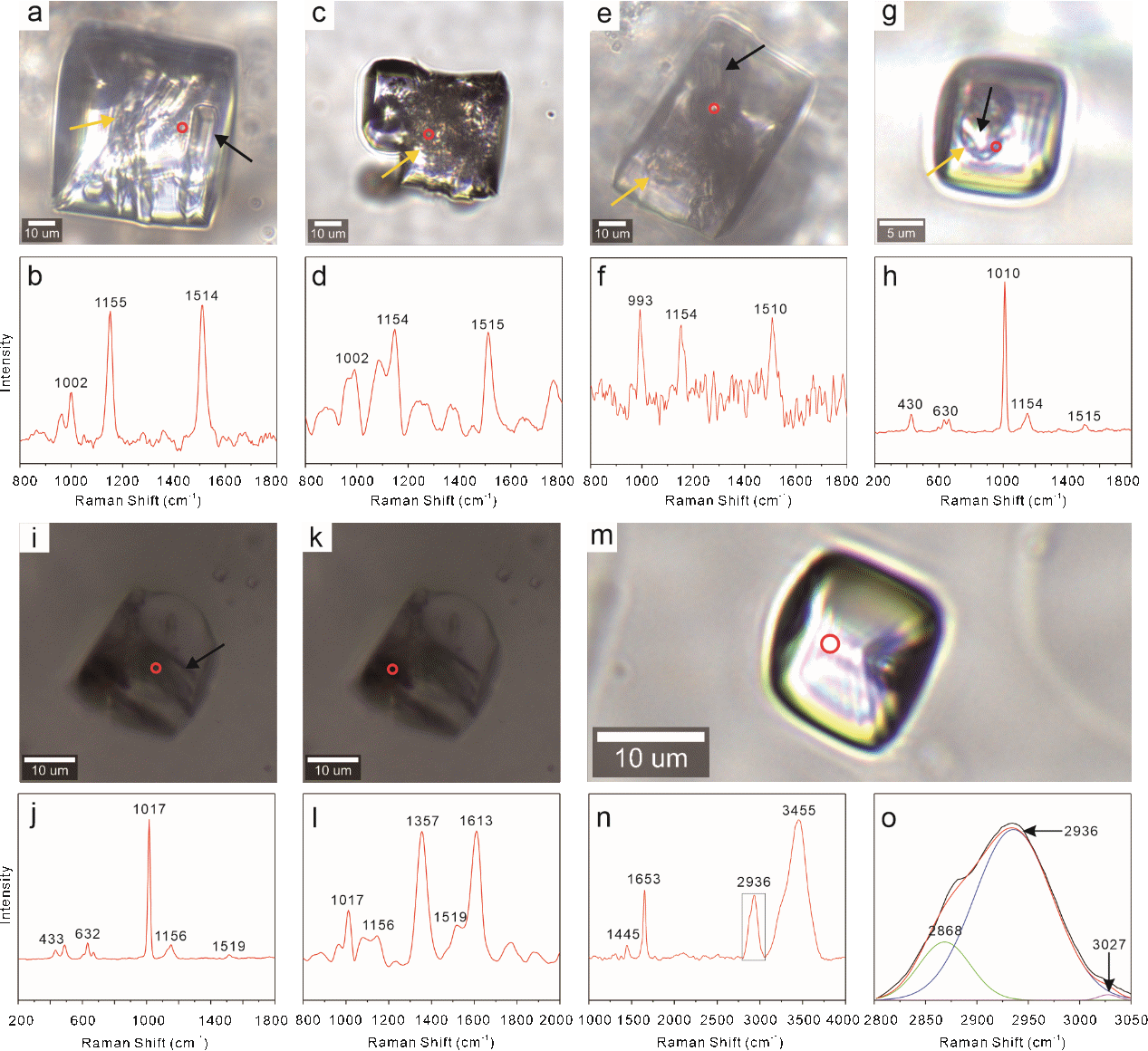 图2 流体包裹体和对应的拉曼谱图(包裹体内的红色圆圈表示激光拉曼的探测点位)。包裹体中包含β-胡萝卜素(黄色箭头)和硬石膏(黑色箭头)。(a-f)不同包裹体中β-胡萝卜素及其对应的拉曼光谱;(g-h)单个包裹体中同时存在硬石膏和β-胡萝卜素;(i-j)包裹体及其对应拉曼光谱,拉曼峰位于1017、1156和1519 cm⁻¹指示β-胡萝卜素的存在,位于433、632和1017 cm⁻¹的拉曼峰指示硬石膏的存在;(k-l)包裹体中含有干酪根(拉曼峰位于1357和1613 cm⁻¹)和β-胡萝卜素;(m-n)包裹体中含有不饱和脂肪酸;(o)图2n中黑色矩形区域内2800 cm⁻¹至3050 cm⁻¹波数范围的曲线拟合结果