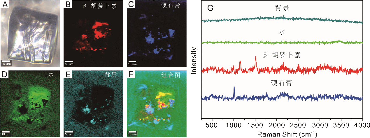 图4 拉曼面扫描分析显示包裹体中β-胡萝卜素和硬石膏的重合分布。(a)与图2a相同的包裹体的显微图像;(b)β-胡萝卜素的二维成像;(c)硬石膏;(d-e)水和包裹体背景的二维成像;(f)由不同物质组成的二维复合成像图;(g)不同物质的拉曼光谱