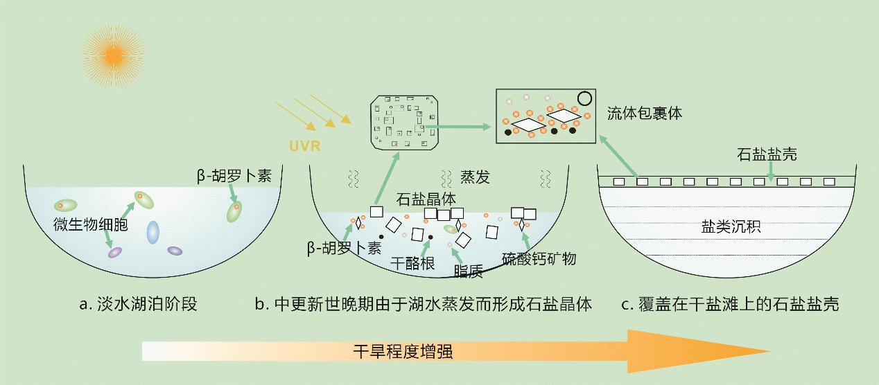 图5 柴达木盆地类火星盐壳石盐流体包裹体保存有机质的模式图。(a) 柴达木盆地早期的淡水湖泊中生存着种类多样的微生物;(b) 湖泊因青藏高原隆生开始蒸发而结晶形成石盐矿物,该过程将有机质、硬石膏矿物等捕获进矿物内部;(c) 湖水干涸后形成的干盐滩,表层被石盐盐壳覆盖
