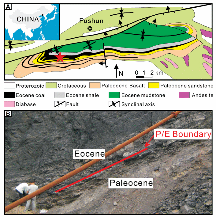 图1 研究区地质背景。(A)抚顺盆地地质概况;(B)研究剖面露头照片