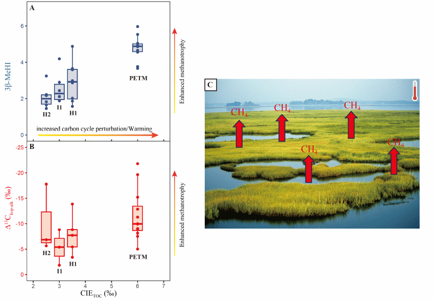 人为碳排放正在引发全球快速变暖及伴随的降雨模式改变,这一过程预计将加剧陆地生态系统CH4排放,进而导致未来的额外升温。因此,准确理解陆地CH4循环对快速升温的响应机制,对精准预测未来气候变化趋势至关重要。然而,由于地球系统的复杂性和现代观测记录的时间跨度有限,科学界对全球变暖背景下生物地球化学正反馈机制的科学认知仍存在局限。在此背景下,研究地质历史暖期陆地CH4循环过程,对预判未来气候演变趋势具有重要启示意义。