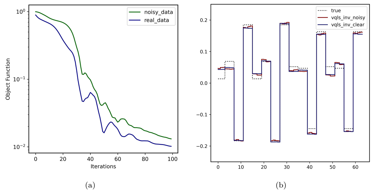 受限于当前中等噪声规模量子(Noisy Intermediate-Scale Quantum,NISQ)计算硬件的退相干效应与系统噪声的干扰,尚不能在实际量子计算机上运行高效的量子线性方程组求解算法,如HHL算法。为此,研究团队探索了一类适合于NISQ时代的量子-经典混合算法——变分量子线性系统求解器(Variational Quantum Linear Solver,VQLS),并将其应用于随机反问题的求解当中。该算法在含有参数的量子线路上求取全局或局部目标函数(如公式1和2所示)并在经典计算机上使用优化算法来寻参,以多次迭代替换高深度的量子线路,通过求解变分问题(类似于训练神经网络那样)得到问题的解。优化过程中目标函数的变化以及反演结果如图4所示。由结果可知该方法具有一定抗噪性,但是针对于VQLS在求解反问题中存在的算法复杂度优势还需要进一步的研究。