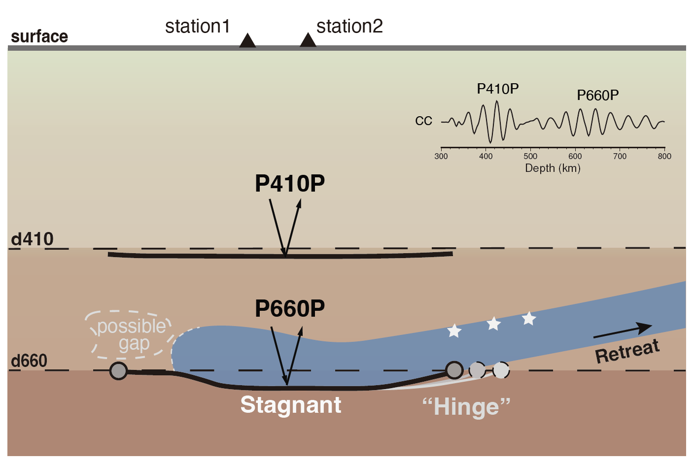 结合前人研究结果对比分析,推测410-km间断面的下沉可能与俯冲板片引起的水含量以及其他矿物组分的改变相关,而660-km间断面的下沉则由板片俯冲引起的地幔温度变化所主导。同时,该研究还厘定了俯冲板片与660-km间断面相互作用的位置(“Hinge”点),该点以西限定了一个横向展布超过400 km的660-km间断面凹陷区,揭示出太平洋俯冲板片在660-km间断面之上渐进式东倾的展布形态。伴随着海沟的后撤,“Hinge”点的位置将逐渐东移,而剖面西侧660-km间断面深度的恢复可能进一步暗示了该区域俯冲板片存在着缺口(Slab gap)(图3)。该研究成果利用地震噪声约束了中国东北下方的地幔转换带结构,为理解俯冲背景下的深部地幔结构提供了新的观测证据,对认识地球深部物质循环与能量传输机制具有重要意义。