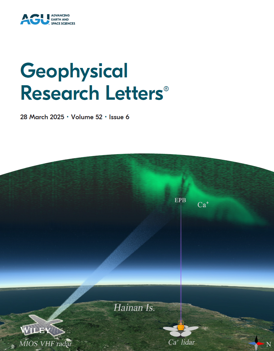 研究成果以封面文章的形式发表于国际学术期刊GRL(孙文杰,焦菁,杨国韬,李国主,解海永,赵必强,朱亚军,王霄,胡连欢,郑浩然,郑兵,杜丽芳,燕春晓,First observation of ionospheric plasma bubble signatures by Ca+ lidar at low latitude [J]. Geophysical Research Letters, 2025, 52 (6): e2025GL114696. DOI: 10.1029/2025GL114696.)。成果受国家自然科学基金项目(42020104002,42404180,42374204,41727803)、中国科学院基础研究领域青年团队稳定支持项目(YSBR-018)、中科院日地网和子午工程等联合资助。