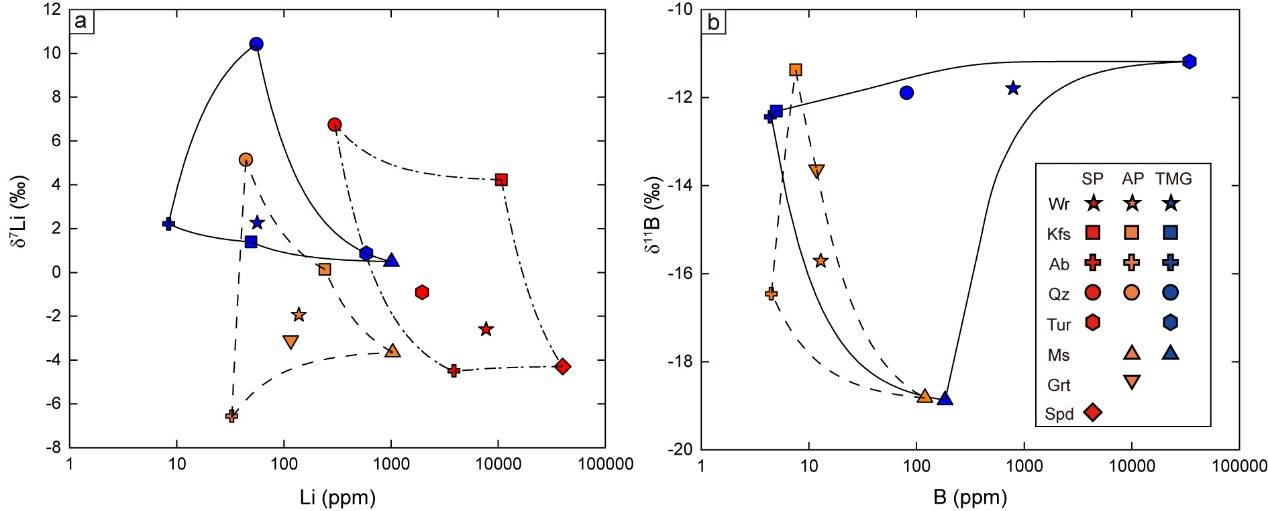 锂和硼作为不相容元素和流体活动性元素,在岩浆演化和热液活动中均可能发生不同程度的同位素分馏。花岗伟晶岩矿床的形成通常经历一系列复杂的过程,例如岩浆分异、流体出溶以及熔/流体与围岩反应等。目前,关于锂和硼同位素在高演化花岗伟晶岩体系中的分馏行为尚缺乏系统性研究。