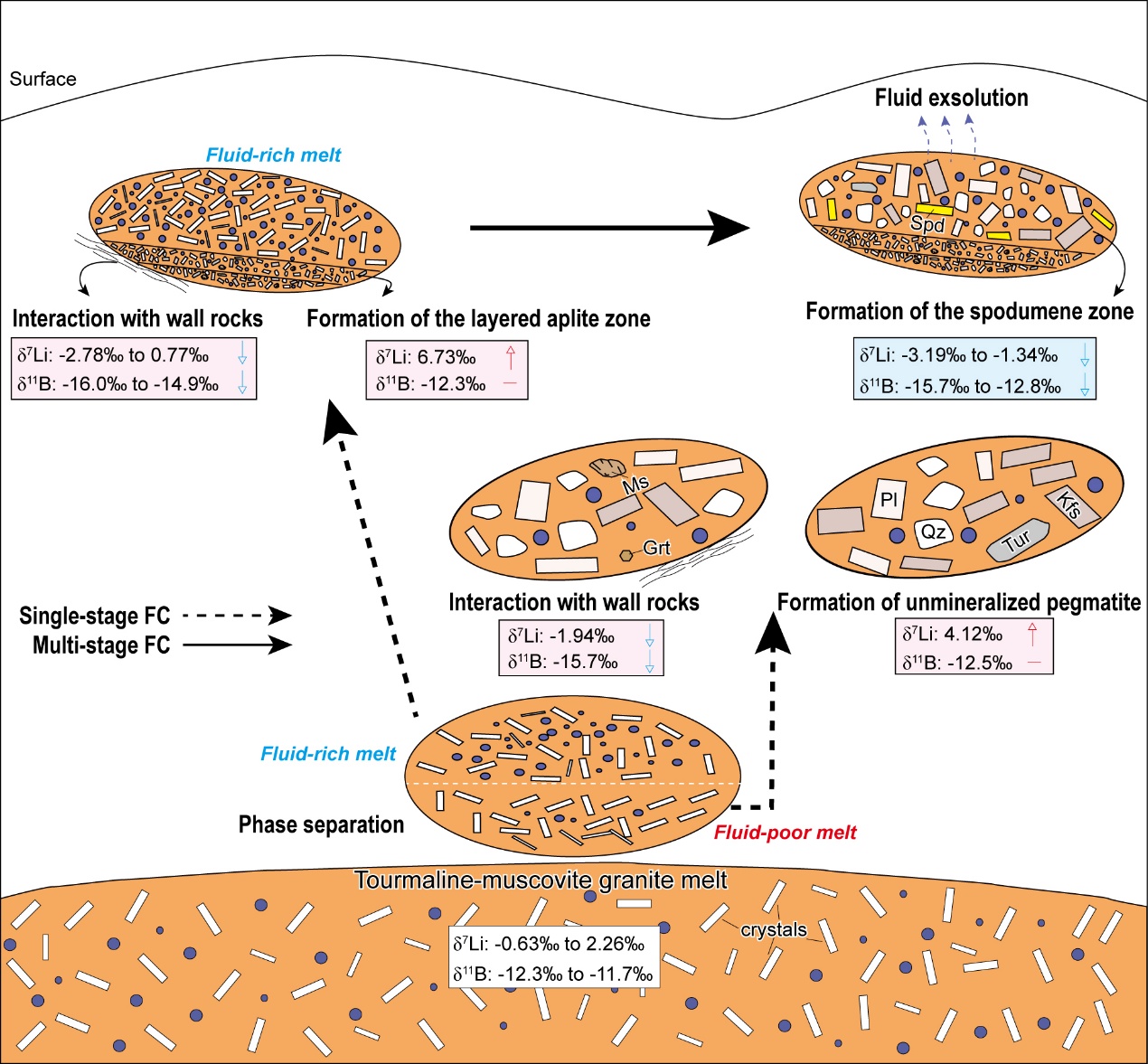 该研究为高演化花岗伟晶岩体系中岩浆分异、流体出溶以及与围岩反应如何控制锂和硼同位素分馏提供系统性研究案例。同时提出多阶段岩浆分异和流体出溶控制锂辉石伟晶岩形成这一模型(图5),为解释喜马拉雅地区锂辉石伟晶岩成因提供新的见解。研究还提出了更多的控制单个岩石样品内不同矿物间同位素分馏的因素。