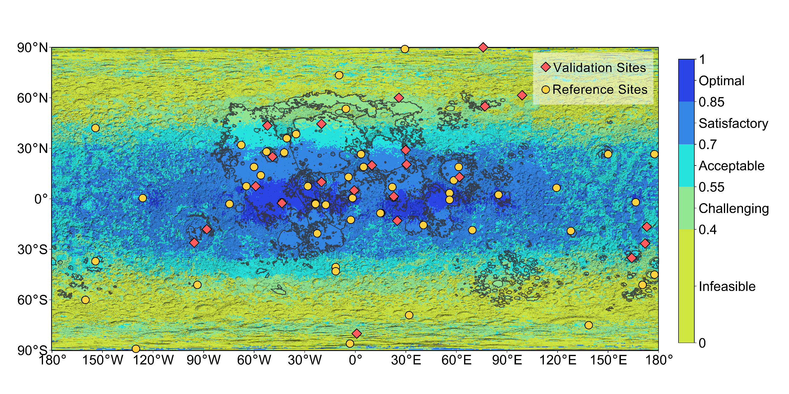 800彩票李守定、李娟、岳宗玉研究员等组成交叉学科研究团队,和中国地质大学(北京)彭建兵院士合作,从月球科研站与基地工程地质适宜性出发,提出了月表地形地貌、长期生存环境、原位资源利用三个方面12个指标评价体系,以26处月球探测历史任务着陆点和50处专家预选点作为约束,采用确定性系数(Certainty Factor)方法研究各个指标对选址的影响,建立了月球科研站和基地选址工程地质评价方法与模型(图1),从全月尺度定量评价了月球科研站和基地工程地质适宜性,分辨率达到2 ppd。