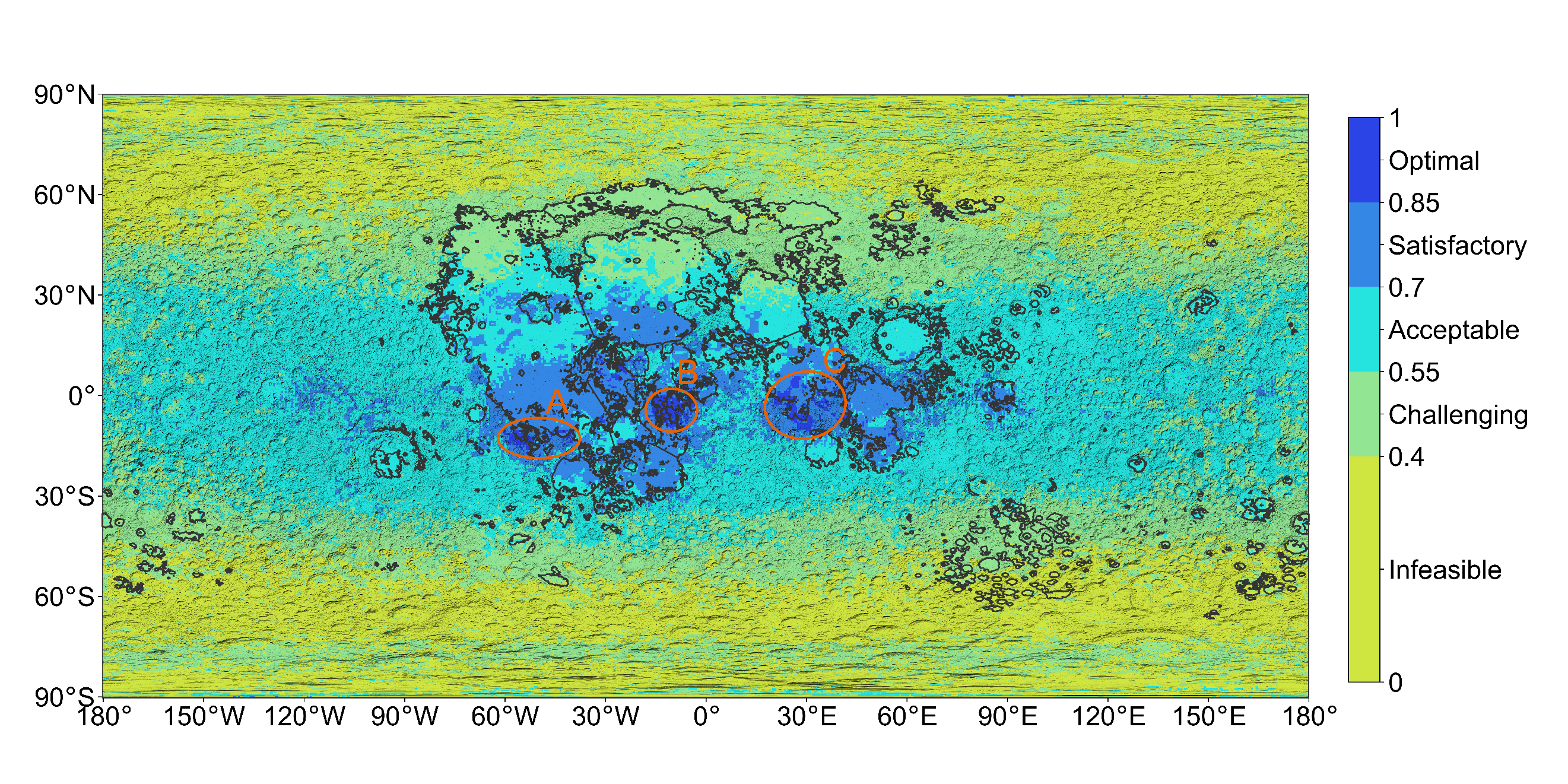 图4 月球基地选址全月适宜性分布图。A、B、C区域是工程地质适宜性最高的区域,A:风暴洋(Oceanus Procellarum)南端;B:岛海(Mare Insularum)南部;C:静海(Mare Tranquillitatis)南部