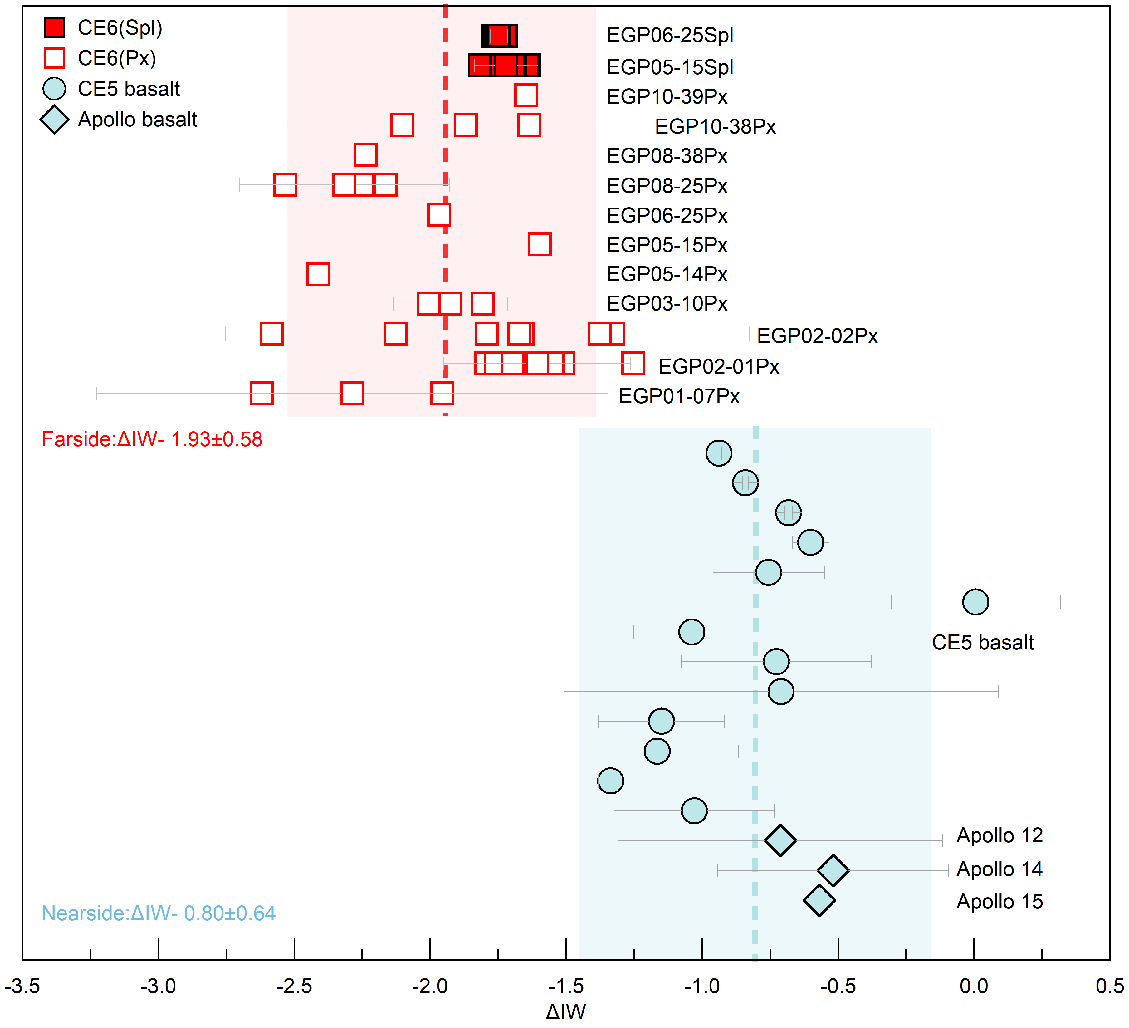 800彩票地球与行星物理院重点实验室博士后张慧娟与其导师杨蔚研究员、吴福元院士及其合作者们,利用尖晶石V氧逸度计和辉石Eu氧逸度计,对23个嫦娥六号玄武岩岩屑进行了研究。结果表明,嫦娥六号玄武岩的平均氧逸度为ΔIW–1.93 ± 0.58,明显低于月球正面的阿波罗玄武岩和嫦娥五号玄武岩(ΔIW–0.80 ± 0.64),指示嫦娥六号玄武岩的月幔源区比正面月幔更加还原(图1),说明南极-艾特肯盆地的下伏月幔不仅具有超干(He et al., 2025, Nature)、超亏损(Zhou et al., 2025, Nature)的特征,而且处于超还原的状态。
