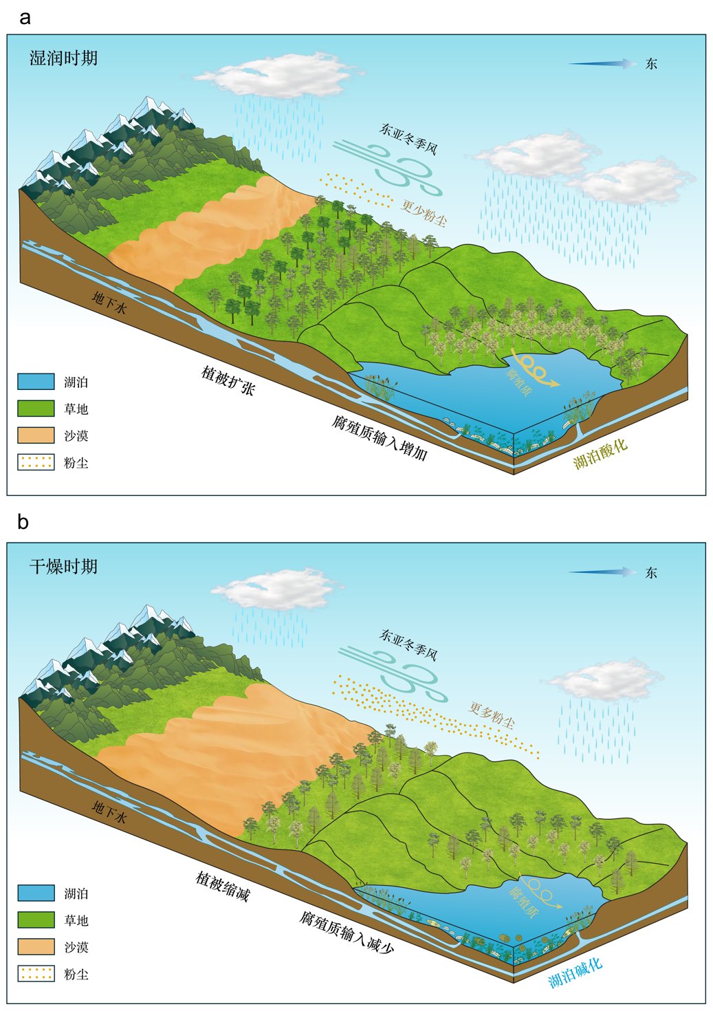 图3 湖泊酸化示意图。在气候湿润期,植被扩张引起腐殖质输入增加,同时大气粉尘输入减少,共同导致湖泊逐渐酸化;反之在干旱期,植被缩减造成腐殖质输入减少,而粉尘输入增加,进而推动湖泊向碱化趋势转变