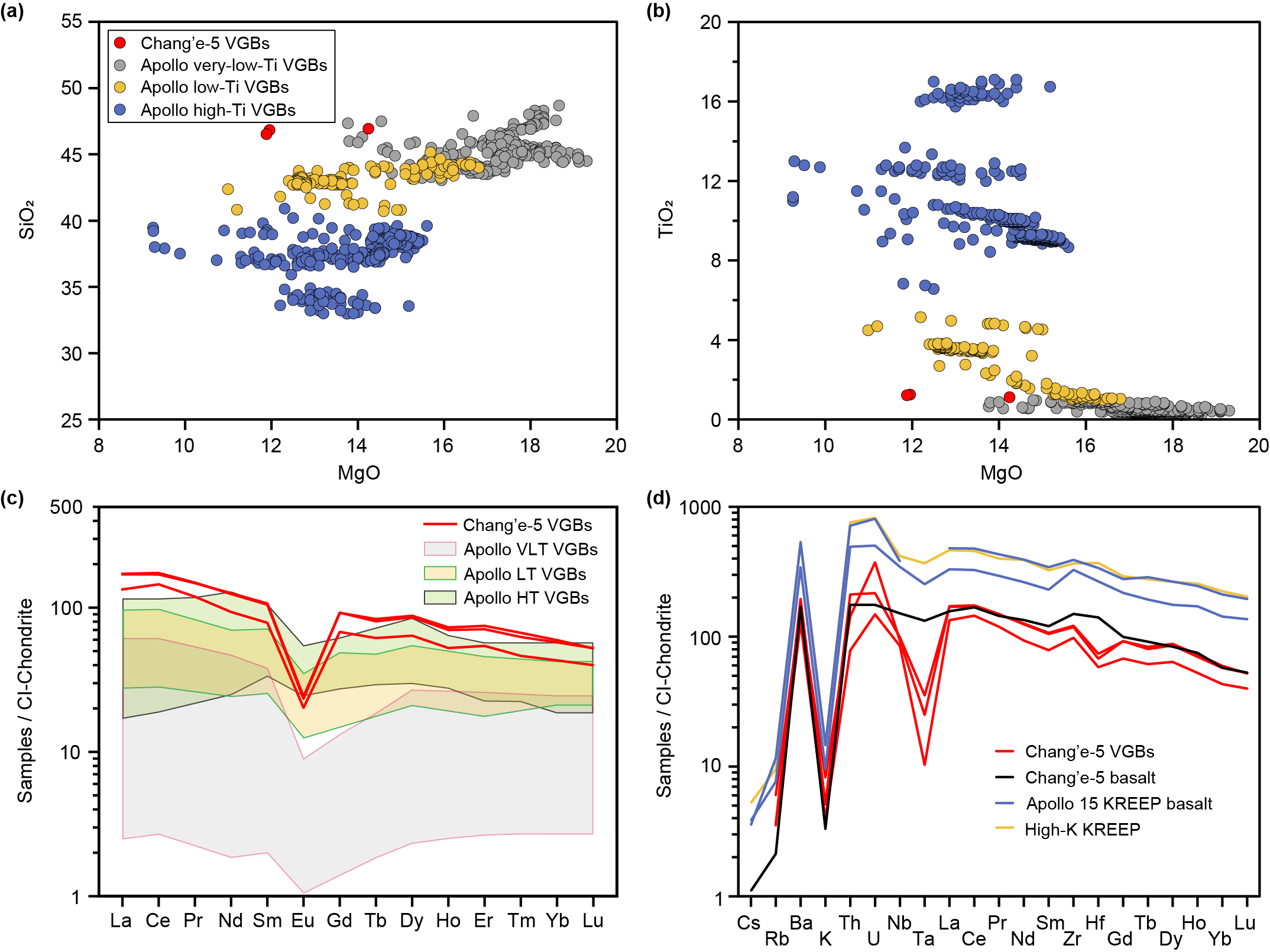 图1 嫦娥五号火山玻璃珠的主量与微量元素组成特征。(a) 嫦娥五号与阿波罗火山玻璃珠的 MgO 含量与 SiO₂ 含量关系图;(b) MgO 含量与 TiO₂ 含量关系图;(c)球粒陨石标准化稀土元素(REE)分布图;(d) 嫦娥五号火山玻璃珠与玄武岩、阿波罗火山玻璃珠与 KREEP 玄武岩,以及高钾 KREEP 的球粒陨石标准化微量元素分布图