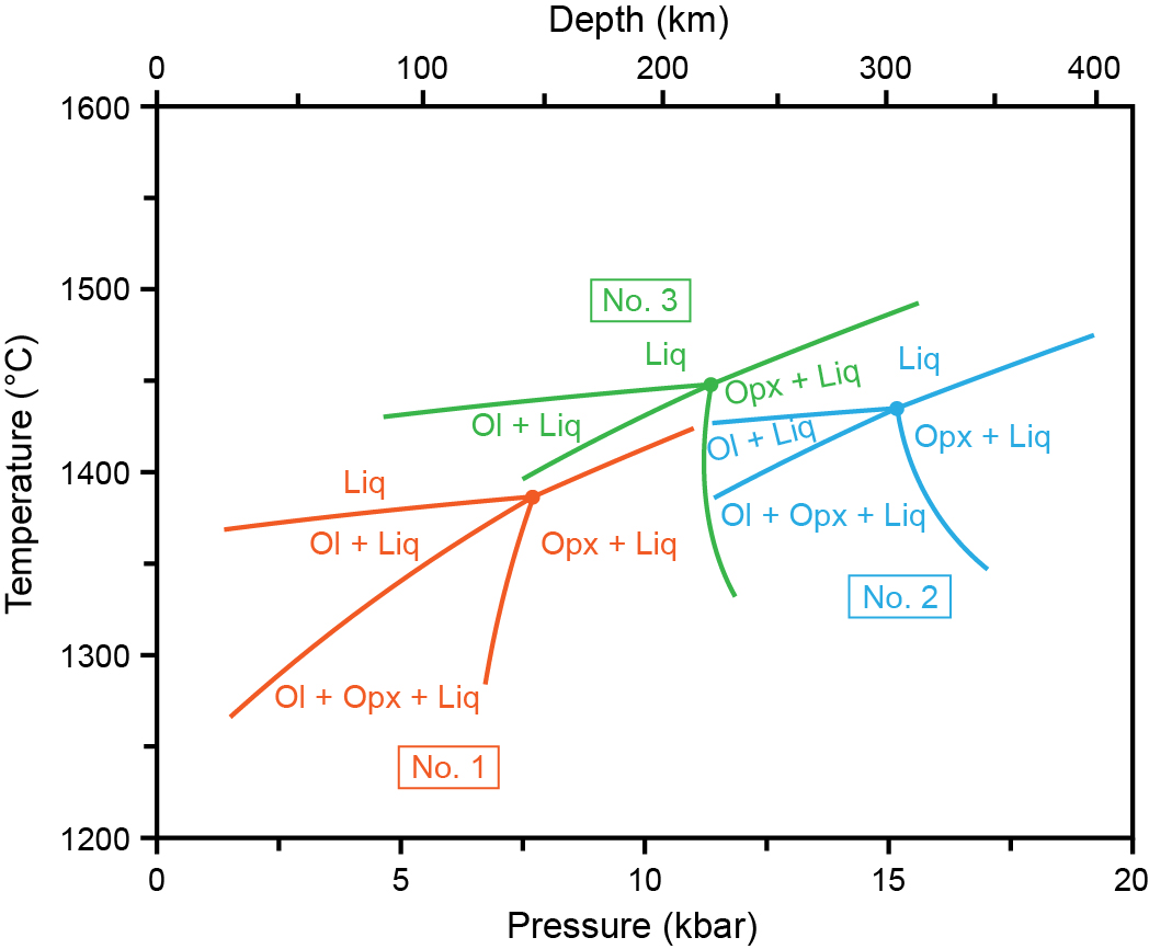 图2 嫦娥五号火山玻璃珠的相平衡计算结果。多相饱和点的压力-温度(P–T)条件计算结果为 7.7–15.2 kbar、1387–1448 °C;液相线上平衡的原始月幔矿物组合为橄榄石+斜方辉石