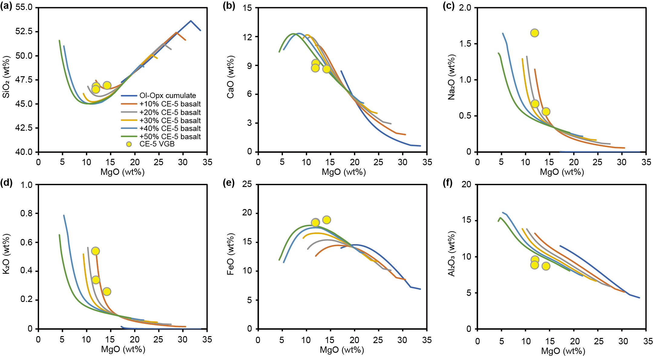 基于三颗火山玻璃的主量元素成分,使用THERMOCALC软件开展了热力学相平衡模拟。通过多相饱和点(MSP)计算,恢复出嫦娥五号火山玻璃的月幔源区深度约为150﹣300 km,且原始月幔组分主要由橄榄石+斜方辉石构成(图2)。部分熔融模拟结果显示,只有向源区中加入经历了低程度部分熔融和高程度分离结晶的玄武质岩浆组分(以嫦娥五号玄武岩为代表),才能最大程度重现出火山玻璃的成分(图3)。考虑到这三颗火山玻璃是风暴洋克里普地体内部的年轻火山喷发产物,下伏月幔中可能存留有未喷发、与嫦娥五号玄武岩类似的岩浆,这种未经喷发而“夭折”的高度演化玄武岩可作为富集端元交代浅部月幔。