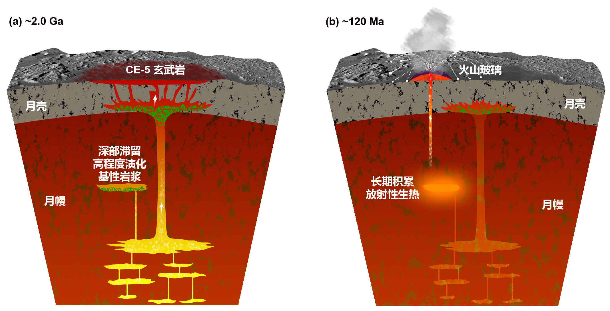 该研究从“夭折玄武岩生热”这一新视角,提出了月球近期火山成因新模型(图5):月幔中保存的高度演化且未喷发的基性岩浆,富集放射性生热元素,不仅可以交代周围月幔,还可通过长时间积累放射性生热,引起局部热异常并触发周围月幔低程度部分熔融,产生小规模岩浆活动。喷发的玄武岩凸显了早期月球的旺盛生命力,未能喷发并留在月幔中的玄武岩仍可长期贡献放射性热能,从而维持月球内部岩浆活力。