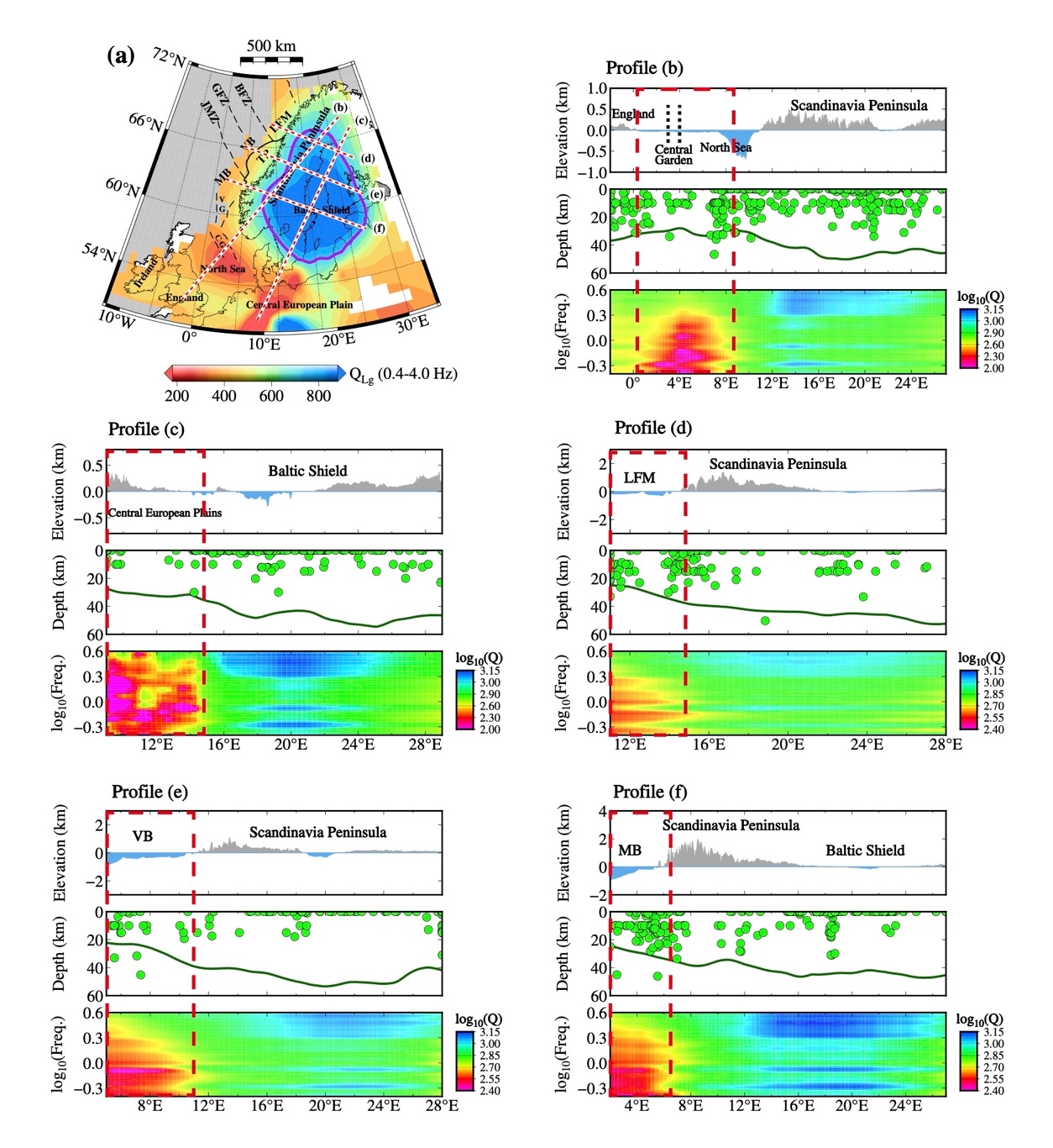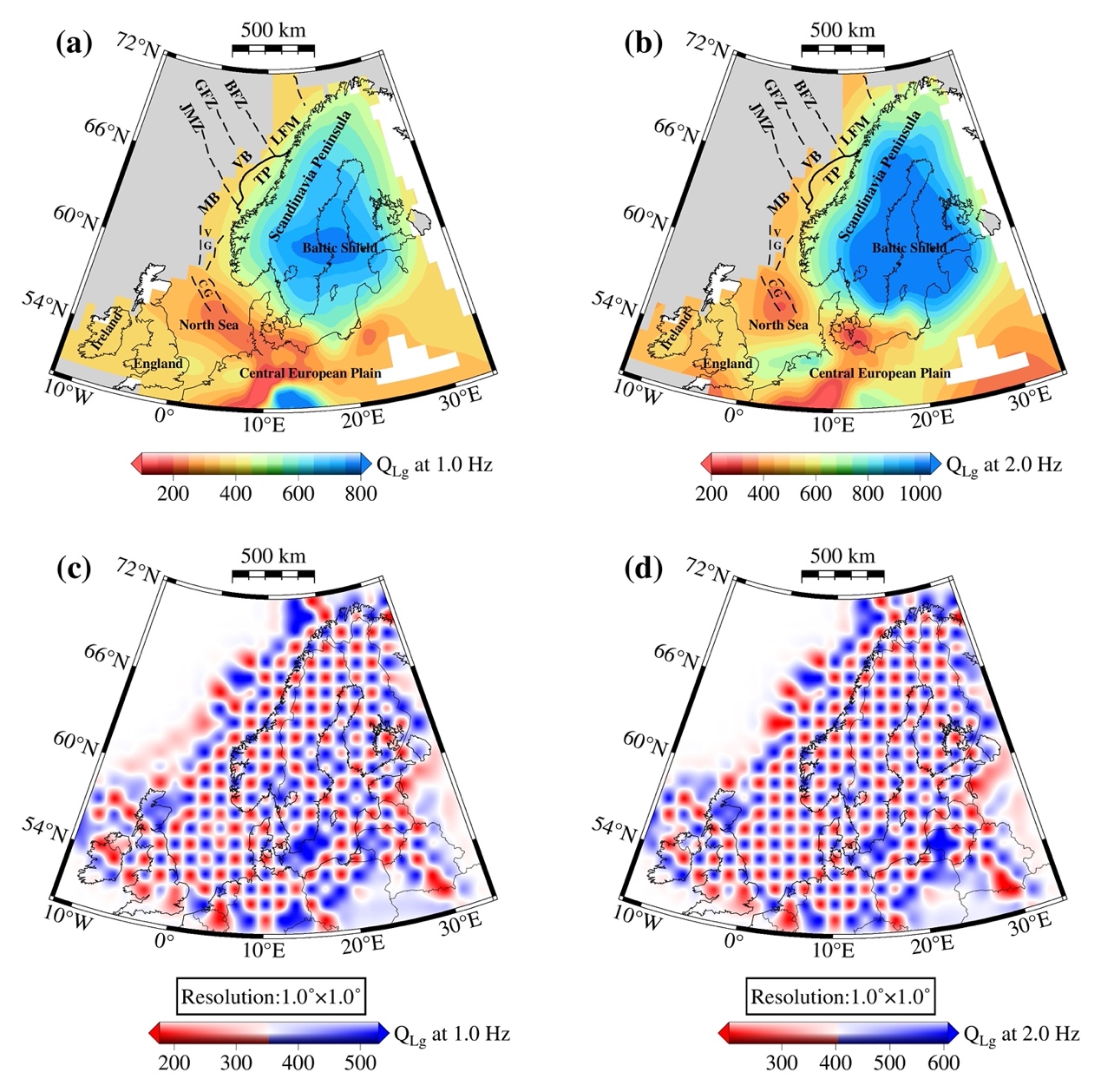 800彩票行星科学与前沿技术重点实验室地震学学科组的博士研究生刘真、导师赵连锋研究员及美国加州大学圣克鲁兹分校谢小碧研究员,与其他合作者一起,根据斯堪的纳维亚半岛周边地区丰富的地震台阵观测数据 (图1b),利用相对成熟的基于单台和双台数据的联合反演方法在此高纬度地区构建了宽频带 (0.05-10.0 Hz)、高分辨率 (~ 110 km) 的地壳Lg波衰减模型 (图2),获得了地壳流变学特征并约束了古老克拉通核的分布范围。