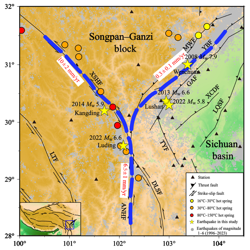 青藏高原是我国大陆现今构造最为活跃的地区,其中大型断裂带广泛分布,强震频发,高温热泉富集。龙门山、鲜水河及安宁河—则木河,三条大型断裂带在高原东南缘汇聚,形成复杂的‘Y’型构造域(图1)。自2008年以来,该区发生了多次强震,包括2008年汶川Mw7.9、2013年芦山Mw6.6、2014年康定Mw5.9、2022年芦山Mw5.8和2022年泸定Mw6.6。此外,该区分布的多个高温温泉的位置与强震位置相符。研究藏东南‘Y’型构造域的强震演化过程与特殊构造之间的关系,对理解青藏高原的构造演化、震源机理以及潜在地震风险具有重要意义。