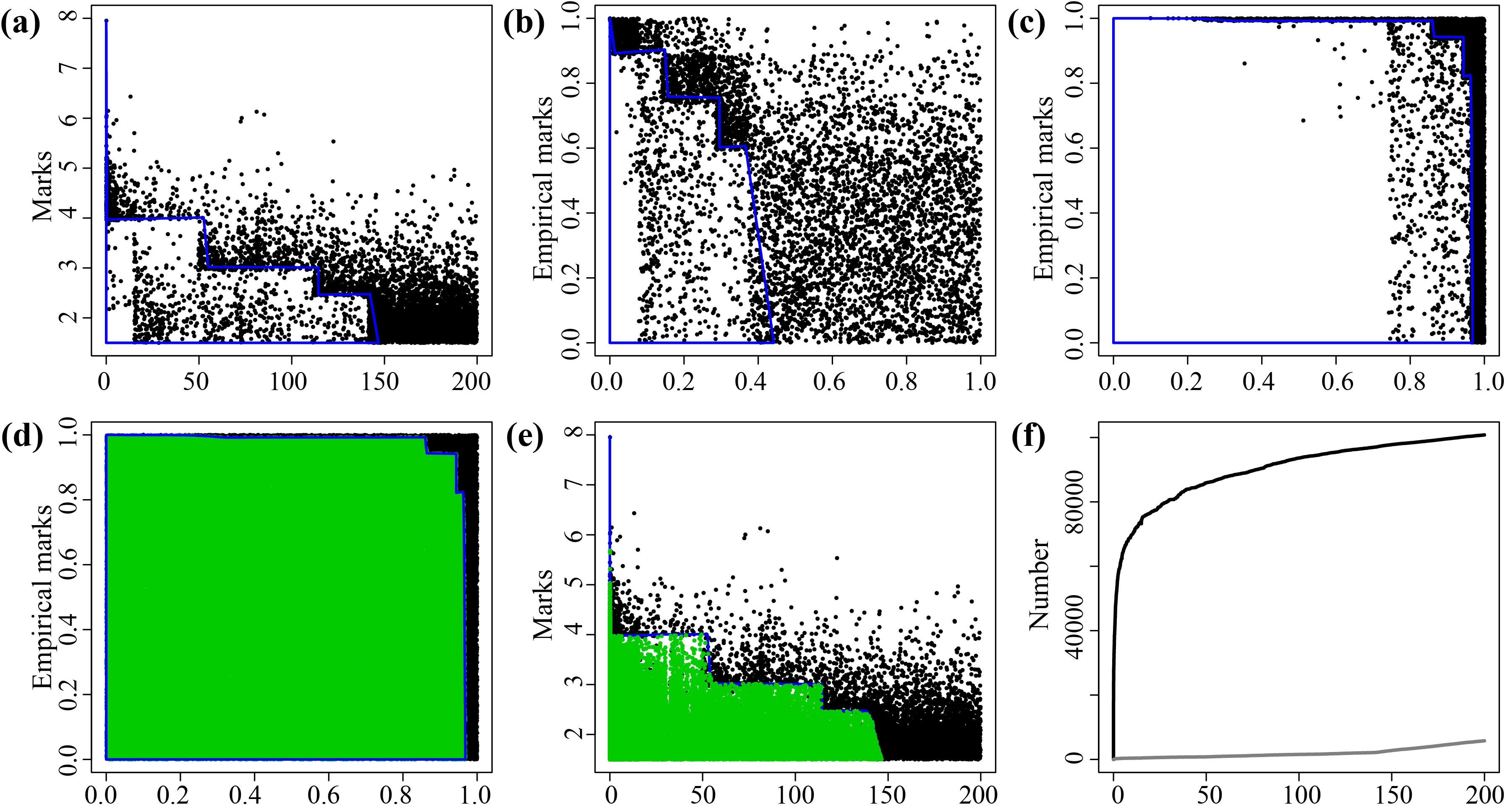 图2 基于统计学补充算法的汶川地震目录构建过程。(a)地震在时间序列上的分布;(b)通过使用双尺度经验变换(BEPIT)得到重新标度的震级与记录事件发生次数的经验分布;(c)重新标度的震级与时间; (d)观测到的(黑色点)和补充的事件(绿色点)的重标震级与重标发生时间;(e)补充后的数据在原始地震序列分布图上的位置;(f)原始数据(灰色曲线)和补充数据(黑色曲线)在时间段内的事件数目