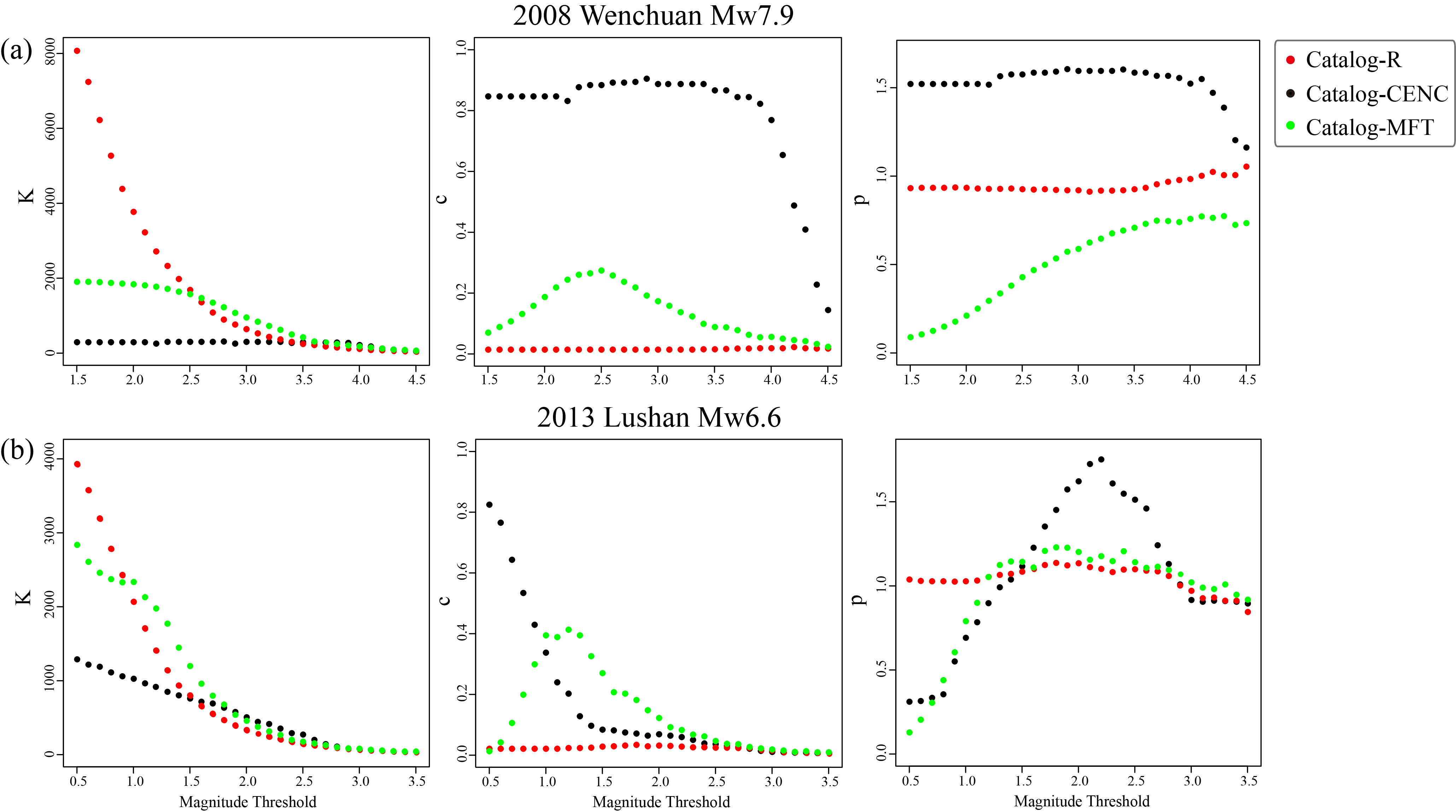 图3 基于统计地震学补全方法的地震目录(Catalog-R:This study)、模版匹配方法地震目录(Catalog-MFT:Wu et al., 2017, JGR; Yin et al., 2018, JGR)与原始地震目录(Catalog-CENC)的Omori Law参数比较图。(a: 2008年Mw7.9汶川; b: 2013年Mw6.6芦山地震)