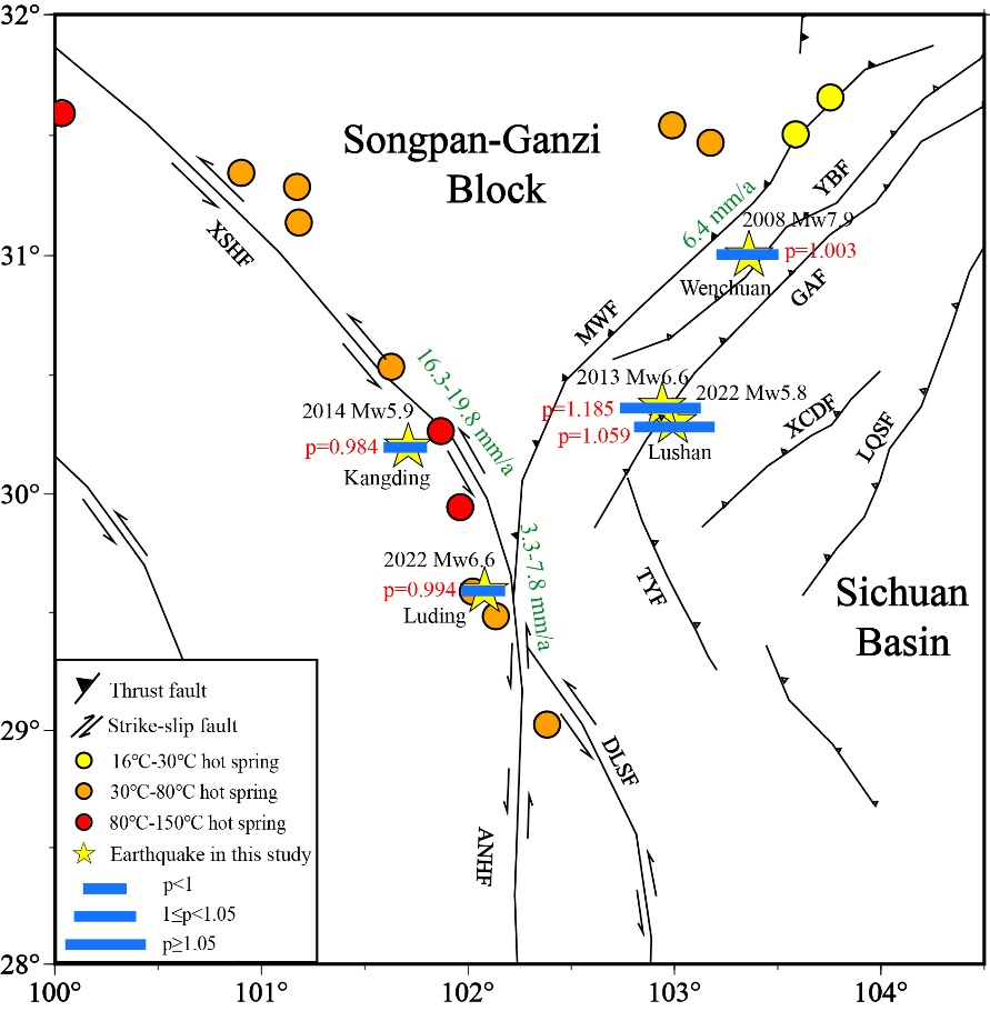 此外,研究团队发现:鲜水河断裂带—2014年康定Mw5.9与2022年泸定Mw6.6地震的发震断裂,分布有高温温泉,𝑝值<1,余震衰减速率较慢;龙门山断裂带中段—2008年汶川Mw7.9地震的发震断裂,温泉温度相对较高,𝑝值≈1.0–1.05,余震衰减速率适中;龙门山断裂南段—2013年Mw6.6芦山与2022年Mw5.8芦山地震的发震断裂,无温泉点分布,𝑝值>1.05,余震衰减速率较快。据此,他们指出:余震衰减参数𝑝���温泉温度呈负相关关系(图4),这为余震活动和区域构造环境之间的关系提供了新视角。