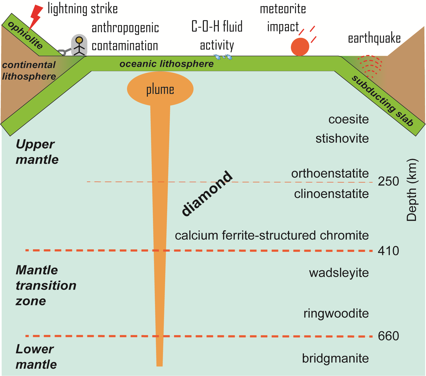 图1 蛇绿岩中异常矿物成因或来源:深部地幔、人为污染、浅部流体、地震、雷击和天体撞击等