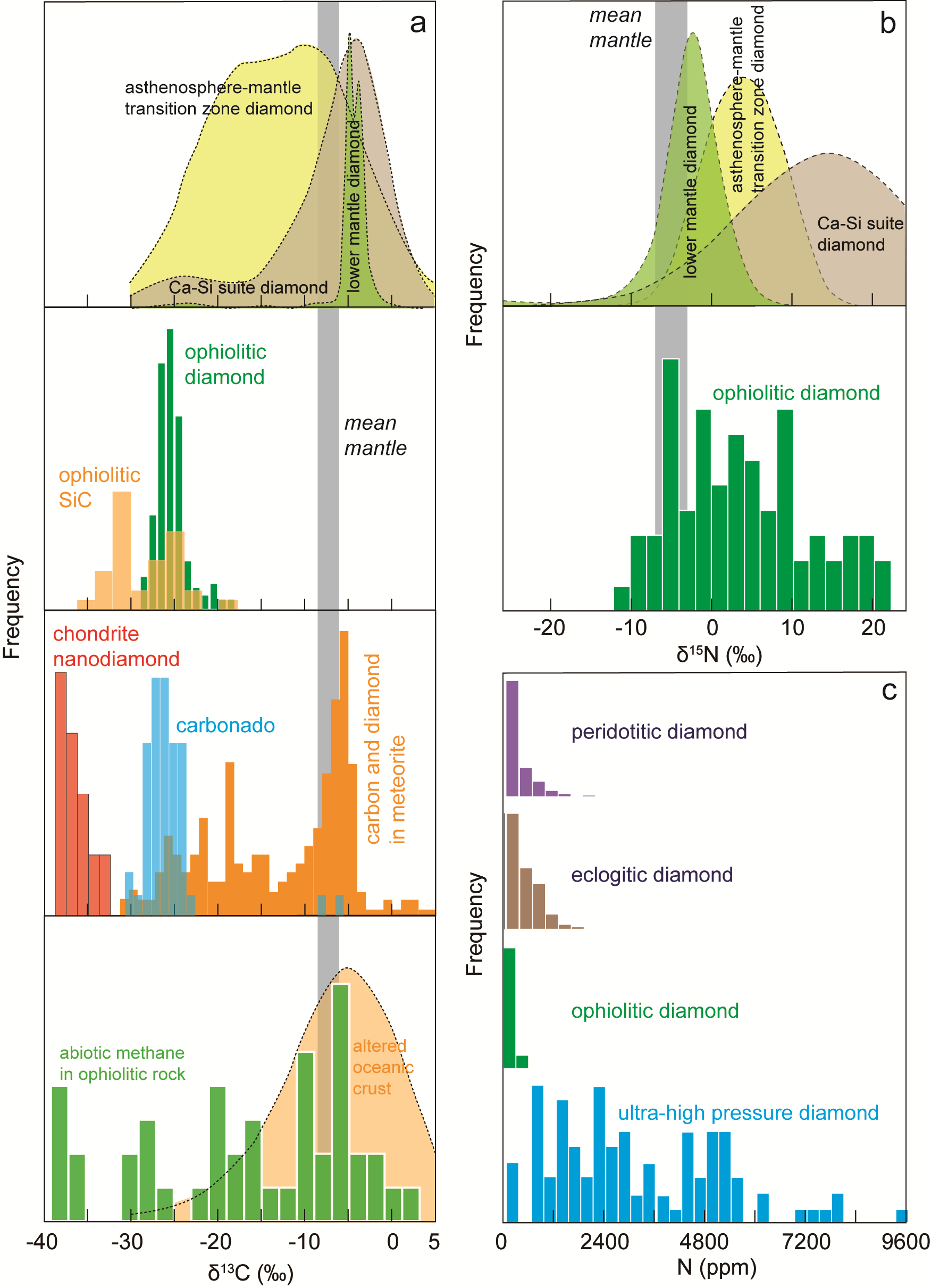 (1)深部地幔起源假说:认为这些异常矿物形成于地幔过渡带甚至下地幔的超高压、超还原环境中,然后通过地幔柱、俯冲板片断离或撕裂等过程被带到浅部并并入蛇绿岩。这一假说无法解释SuR矿物(如SiC)在典型地幔氧逸度条件下的化学不稳定性;难以解释金刚石和碳化硅中异常轻的碳同位素、金刚石Ib型和低氮含量等非典型地幔特征(图2);将地壳矿物包裹体带入地幔深部的动力学过程也难以解释。