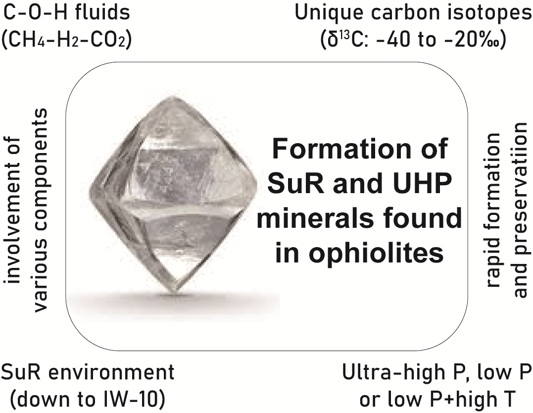 图3 蛇绿岩中异常矿物(以金刚石为例)形成的物理化学条件总结