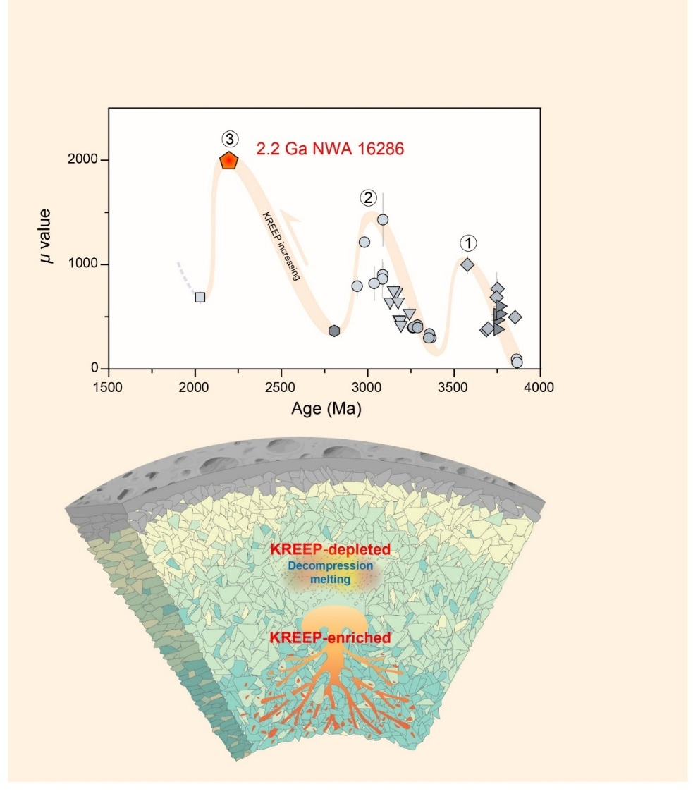 更令人惊讶的是,该陨石的月幔源区表现出异常的地球化学特征:其238U/204Pb高达 2000,远超大多数月海玄武岩(通常为60–1000);同时其εNd(t) 值低至 –4.3,与典型KREEP玄武岩源区非常接近。这些特征明确表明,该玄武岩源自一个富集KREEP组分的月幔源区。这一发现将月球KREEP相关的火山活动的存续期延长了约 8亿年,续写了月球“热引擎”的功能。