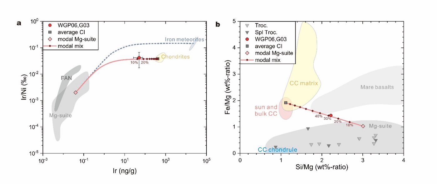 进一步的成因约束由全岩的化学组成提供。研究样品的全岩成分具有异常高的铱元素含量(Ir = ~50 纳克/克,图4),高出月球火成岩两个数量级。研究进一步构筑了定量的月球物质和碳质球粒陨石组分的混合模型,用以解释该特殊橄长质岩石的成因(图4)。通过全岩的稀土元素配分以及三氧同位素组成,模型分别采用了月球镁质岩套苏长岩和CI或CY型碳质球粒陨石作为混合的前体物质。计算表明,约10%-30%的碳质球粒陨石与90%-70%的月球镁质岩套苏长岩混合,可以产出研究样品的全岩组成。综上,这颗含尖晶石的橄长质岩屑被归因为CI或CY型碳质球粒陨石冲击月球镁质岩套发生熔融混合后快速冷却结晶的产物。