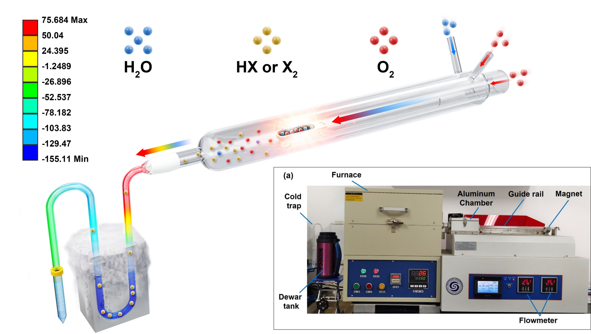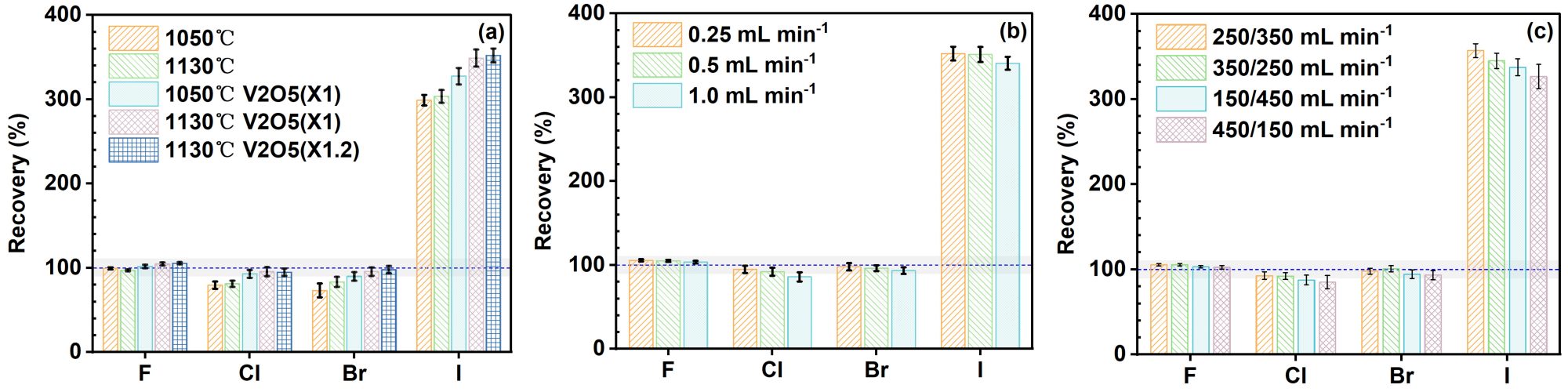 高温水解技术的核心在于使样品在高温下与水蒸气、氧气充分反应,将卤素从矿物晶格及难熔材料中彻底释放,并转化为可吸收的挥发性卤化物。该研究通过大量实验,从V2O5,MoO3,WO3,和U3O8中筛选出最优催化剂V2O5,并确定了最佳反应温度(1130℃)、混合气体配比(氩气250 ml/min + 氧气250 ml/min)及水流速(0.25 ml/min)(图2)。该条件体系成功解决了地质样品卤素分析中“样品分解不完全”的关键难题。