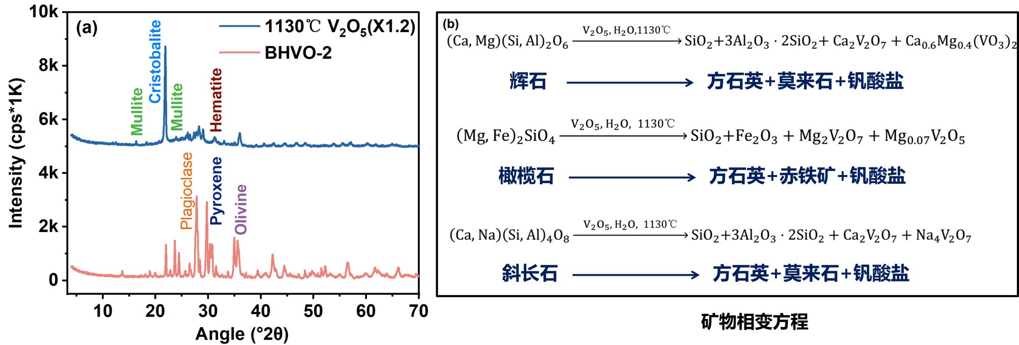 V2O5作为高效催化剂,能与矿物组分反应生成中间态、低熔点的钒酸盐复合物,显著促进矿物分解。以玄武岩标样BHVO-2为例,在最优反应条件下,其原有矿物相(如斜长石、辉石、橄榄石)发生显著相变,生成方石英、莫来石、赤铁矿等新相(图3),证实反应彻底。从化学动力学角度看,V2O5通过构建多步反应路径,有效降低反应活化能;热力学上,持续高温(1130℃)则为反应向右进行提供了强劲驱动力。氧气营造的氧化环境可确保有机物与还原组分被彻底氧化;水蒸气不仅作为水解剂直接破坏硅氧键,也作为吸收剂溶解气态卤化氢(如HF、HCl等),防止HF与石英管壁反应造成损失,同时作为传输载体将释放的卤素高效转移至后端吸收体系。