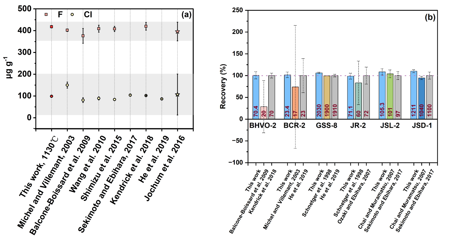 在优化实验装置与反应条件的基础上,系统建立了相应的离子色谱-等离子体质谱(IC-ICP-MS)分析流程,并通过对一系列标准物质的大量分析,证实了该方法在卤素测定中的准确性与适用性。结果表明,团队开发的装备与方法对氟、氯的测定结果相较于国际其他实验室具有更高的准确度与精密度(图5a)。对于含量极低的碘,方法的数据精度显著优于其他采用高温水解技术的实验室,并与放射化学中子活化分析及中子照射惰性气体法的结果高度一致(图5b,中间柱状图为国外其他实验室,采用高温水解技术获得的数据,灰色柱状图为中子活化分析结果)。