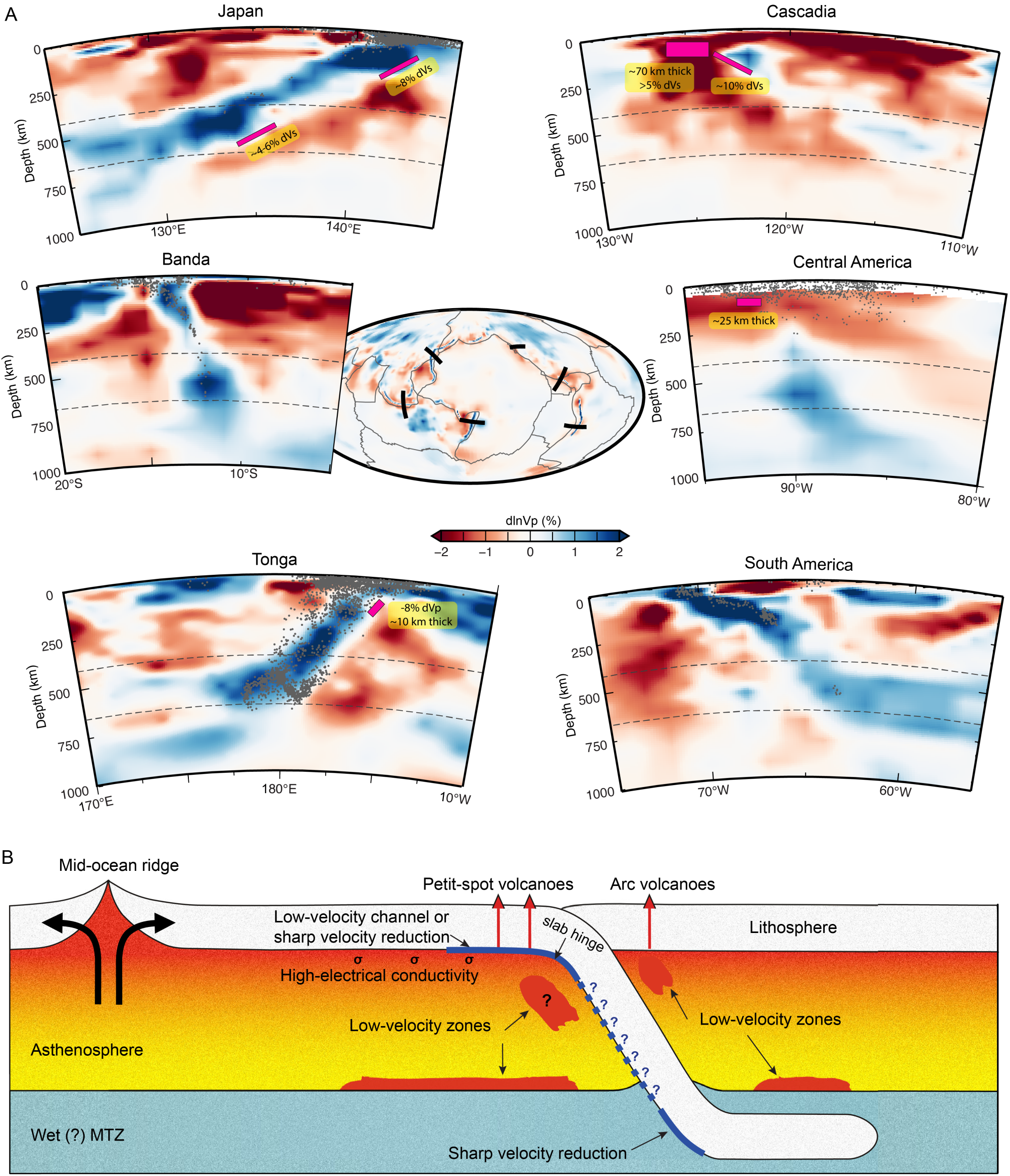 1 地震学观测揭示全球不同俯冲板片下方的LVZs及卡通示意图