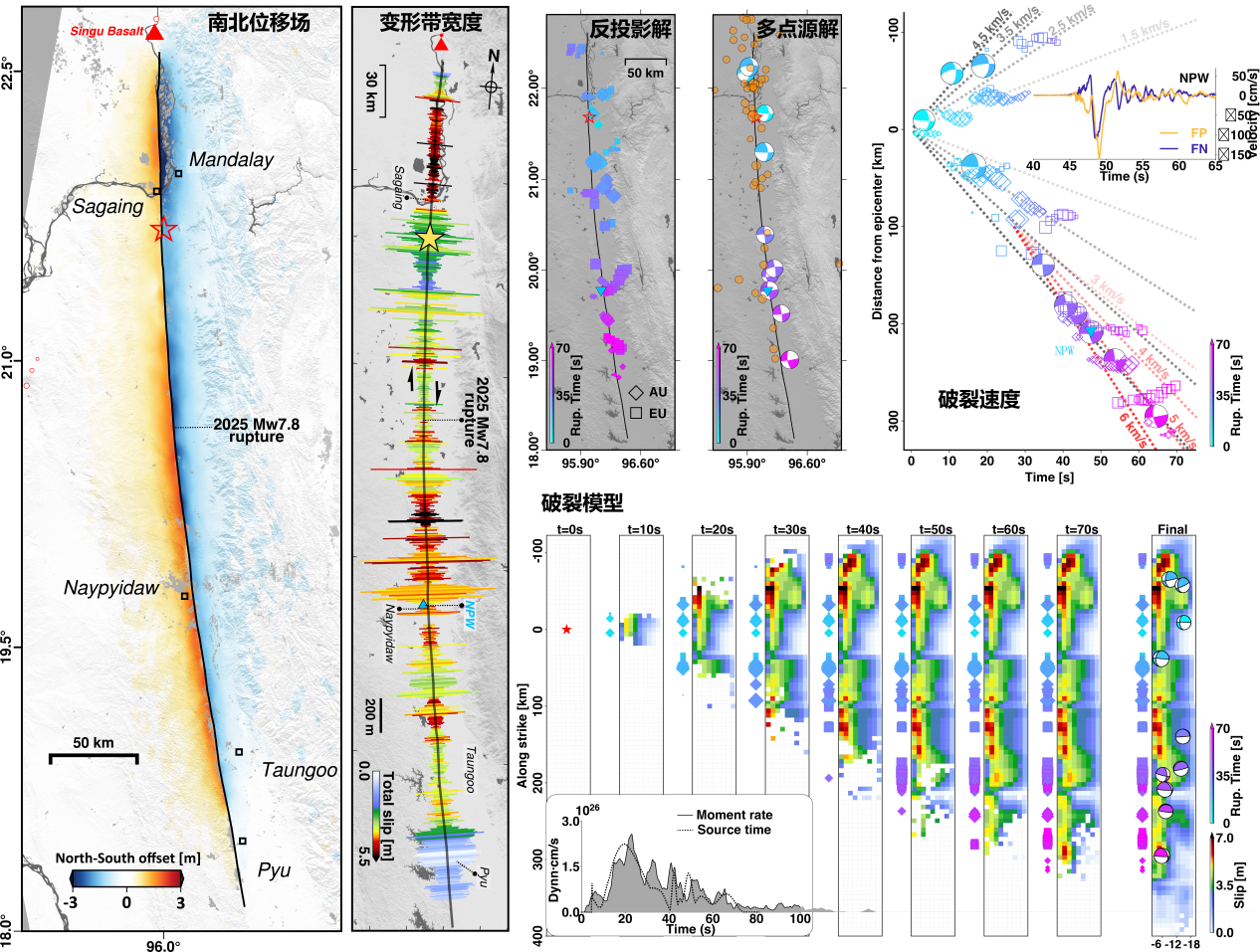 为深入探究超剪切强震破裂的震源物理机制及其与断层损伤带之间的关系,800彩票韦生吉研究员、王新特聘研究员及陈凌研究员,联合中国地震局地质研究所单新建研究员团队、莱斯大学施其斌博士、南洋理工大学曾洪玉博士、密歇根大学黄一荷教授等,深度融合地震学和多源影像大地测量,利用高分辨率地震形变、地震破裂过程运动学反演和接收函数断层带结构成像等技术方法,构建了2025年缅甸地震高精度地表三维形变场,刻画了同震损伤带宽度,反演了破裂速度、多点源机制解及动态破裂过程,约束了发震断层带波速降和几何特征(图1)。这些结果揭示,在宽断层损伤带内,亚剪切—超剪切转换距离及持续超剪切破裂,与震源动力学模拟结果具有高度一致性,为理解此类强震破裂物理机制提供了关键证据。