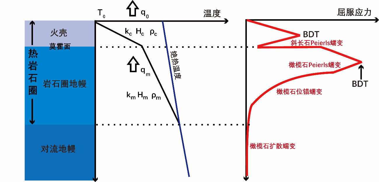 图1 火星岩石圈的温度和流变模型, 左侧表示火星典型的分层结构,中间代表可能的温度曲线,其中蓝色线代表地幔的绝热温度。右侧表示对应温度的屈服强度包络及可能的变形机制