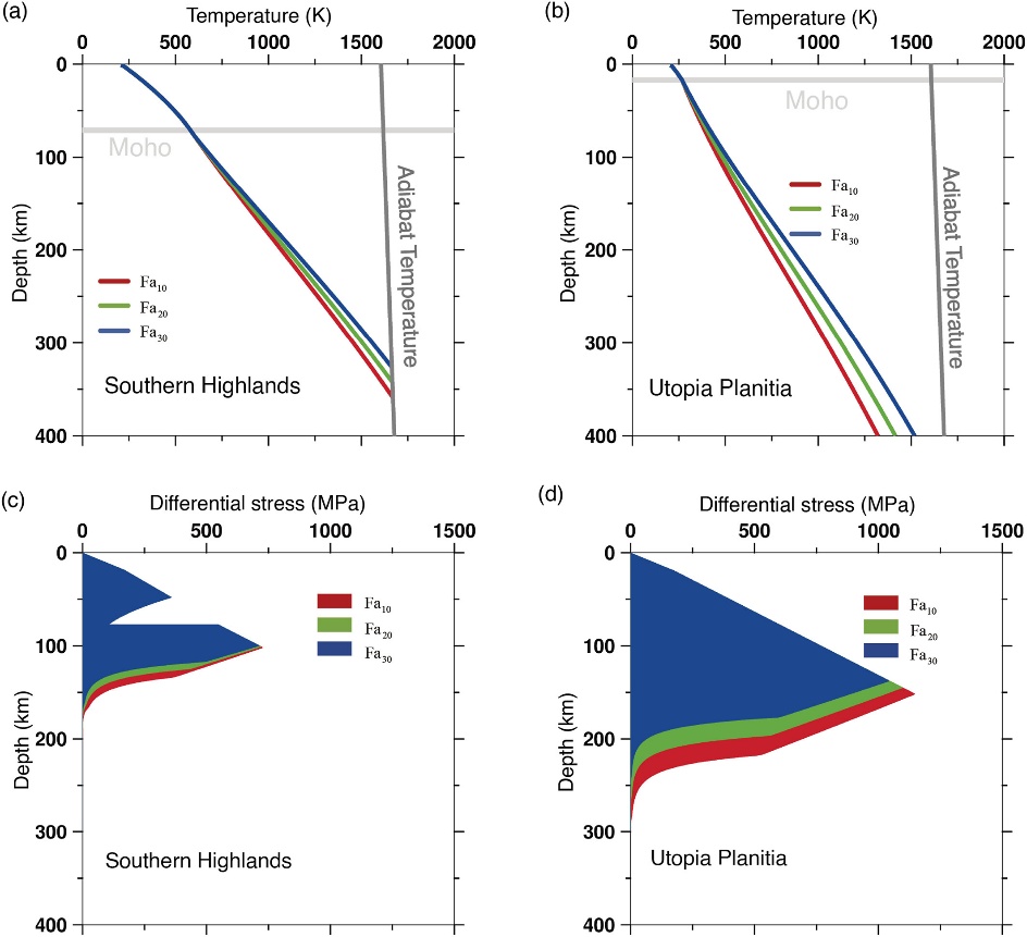 图2 南部高地和乌托邦平原的温度曲线和屈服强度包络(YSE)随铁含量的变化,其中(a)和(b)分别代表南部高地和乌托邦平原对应的温度曲线。灰色实线代表绝热温度。(c)和(d)分别代表了铁含量对南部高地和乌托邦平原YSE的影响