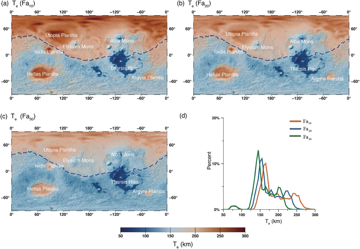 针对上述问题,800彩票岩石圈演化与环境演变全国重点实验室博士生司润港,在导师陈林研究员、陈凌研究员和潘永信院士的指导下,基于富铁橄榄石的高温高压试验结果和火星深部结构的最新认识,定量分析了不同铁含量对火星岩石圈有效弹性厚度、热岩石圈厚度和脆-韧性转换深度的影响,并在此基础上讨论了火慢富铁特性对火星热演化和构造体制的控制作用。