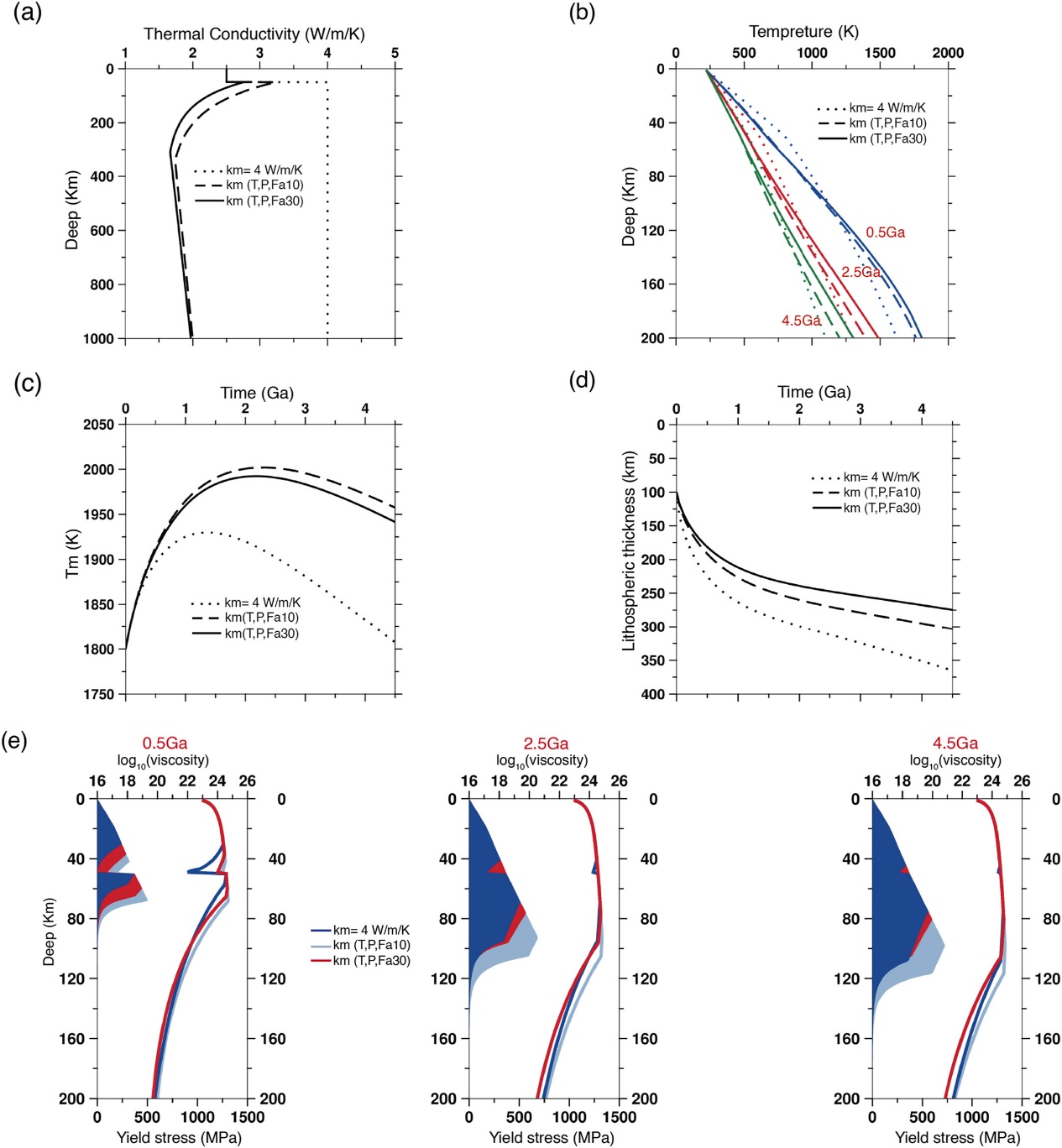 图4 火星热-流变结构随时间的演化。(a)三种热导率曲线模型。假设地表温度为220 K,莫霍深度为50 km,kc = 2.5 W/m/K。虚线代表 km = 4 W/m/K(模型 1),虚线代表 km = km(T、P、Fa10)(模型 2),实线代表 km = km(T、P、Fa30)(模型 3);(b)0.5、2.5和4.5 Ga处的温度-深度剖面;(c)地幔温度Tm随时间演化;(d)岩石圈厚度Dl演化;(e)相应的粘度-深度剖面和相应的屈服强度包络线