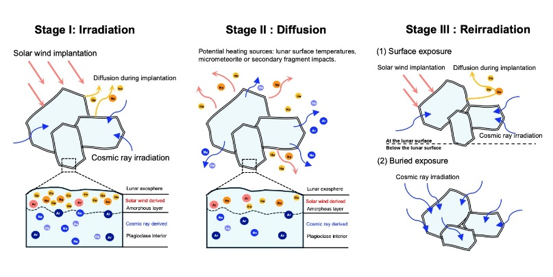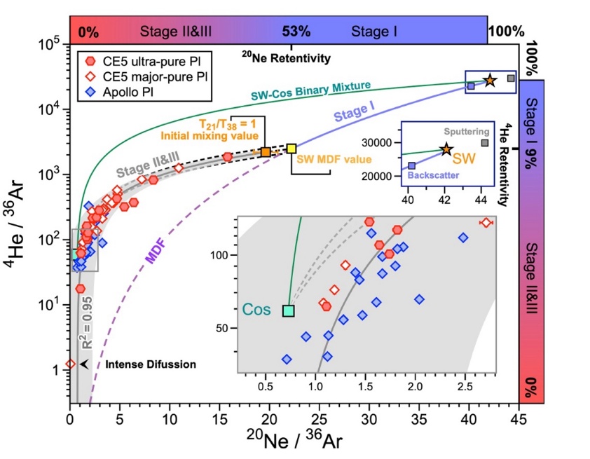 太阳风是太阳系内部传递挥发分的重要枢纽。月壤因长期暴露在太阳风中,成为保存挥发分的理想材料。然而,太阳风在注入月球表面(时)后可能会经历扩散、溅射、磨蚀等复杂过程。稀有气体(氦、氖和氩等)因其独特的化学惰性可能能作为这些复杂过程与太阳风相互作用的稳定示踪物。以往基于阿波罗样品的研究发现,月壤中的稀有气体丰度与现今太阳风的初始组成存在系统偏差。这种偏差究竟代表了太阳本身的变化,亦或是太阳风植入月表之后的二次改造?早期的热扩散实验与理论模型对部分过程进行了解释,但驱动这些分馏现象的核心机制仍不清楚。这些未知的分馏过程可能是了解太阳风与月表相互作用以及月表挥发分传输机制的关键。