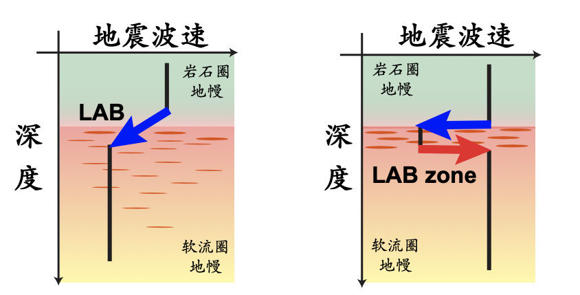 图1 LAB为单一地震波速度突降面(左)与LAB zone作为结构复杂的多层系统(右)的示意图