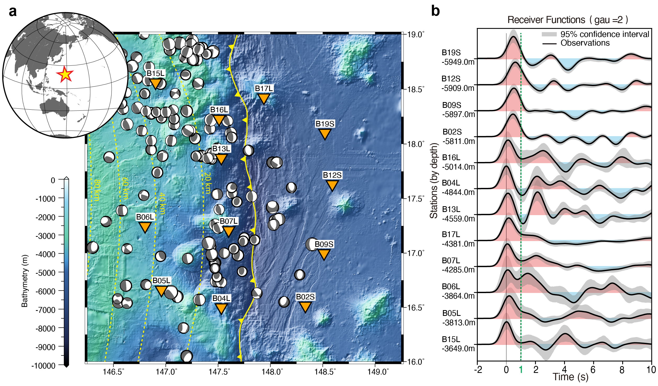 图2 马里亚纳海沟区域及单台 OBS 接收函数波形。(a) 橙色倒三角为本研究采用的 OBS 台站位置;黄色实线表示海沟,灰色震源球来自 GCMT 目录(1900–2023),黄色虚线表示 Slab 2.0 模型给出的俯冲板片深度;(b) 各台站观测获得的径向接收函数,按 OBS 部署深度由浅至深排序