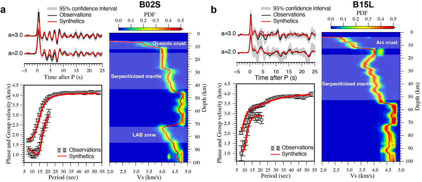 图3 示例 OBS 台站的观测数据与反演结果。(a) B02S 台站,位于板片俯冲前的海沟外侧;(b) B15L 台站,位于板片俯冲后的弧前区域。图中展示了不同滤波频带下的接收函数观测波形及其反演拟合结果、对应的面波频散曲线与拟合结果,以及反演获得的S波速度模型的后验概率密度分布。Vs模型中红线表示反演得到的平均速度结构。图中高亮区域分别标示了地壳、与地幔水化有关的上地幔低速层以及富熔融的岩石圈–软流圈边界