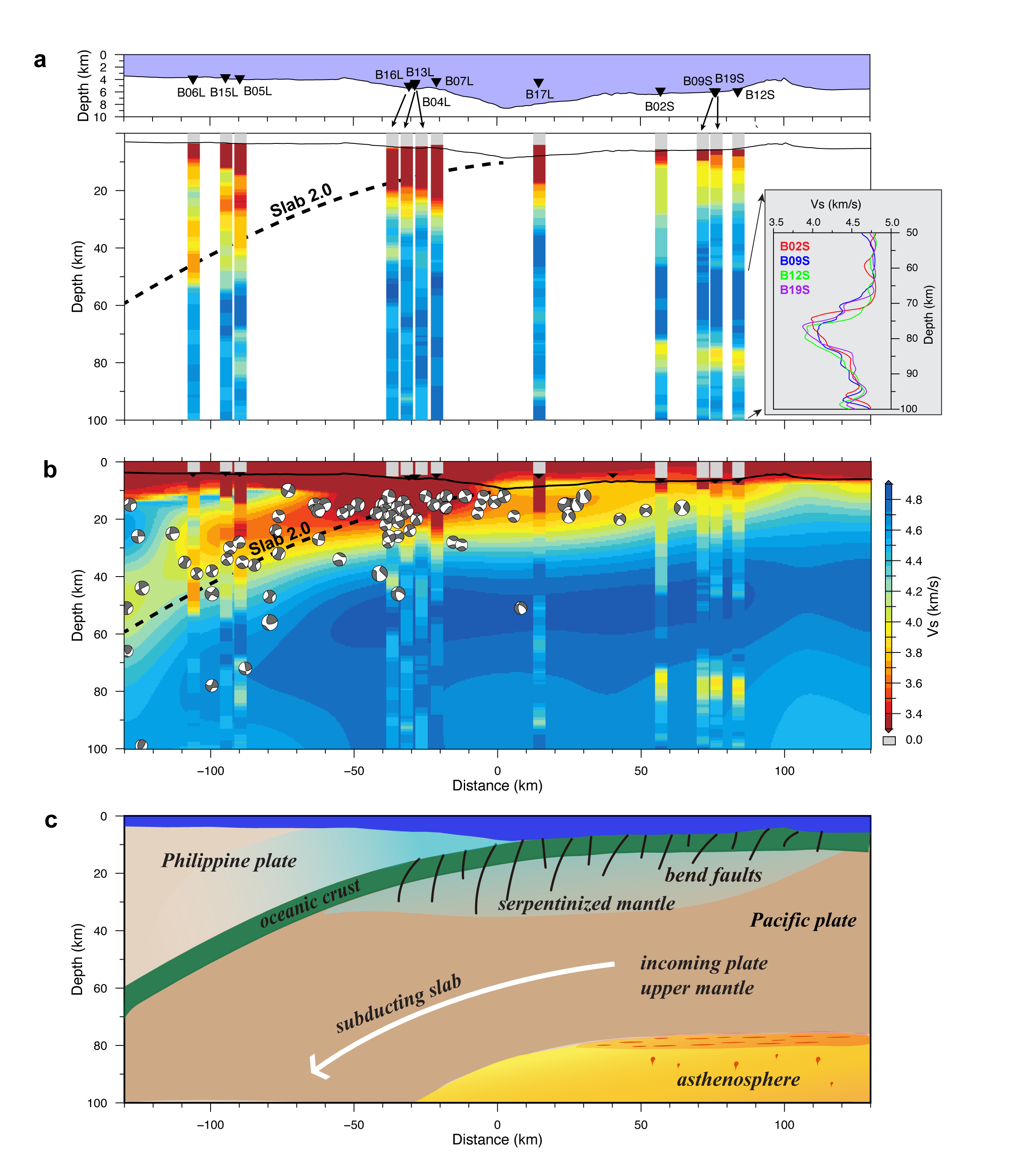 图4 (a) OBS 台站下方的一维 S 波速度结构沿海沟法线方向投影。粗虚线表示 Slab 2.0 模型。上方图像显示沿剖面测得的海底地形数据及台站位置。右侧插图突出显示了岩石圈底部观测到的低速区;(b) 与Cai et al. (2018)速度结构的对比;(c)马里亚纳俯冲带区域结构示意图