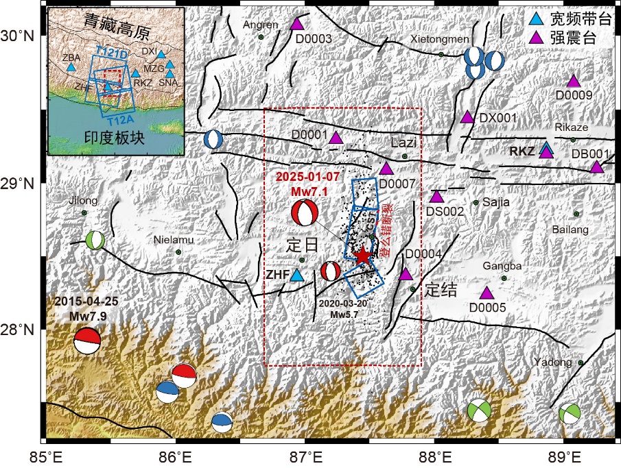 定日地震震中区平均海拔超过4000米,固定地震台站分布稀疏,这给精确测定震源深度及重建其精细时空破裂过程带来显著挑战。围绕此次地震,两个关键科学问题亟待厘清:(1)破裂是沿着单一断层面传播,还是涉及多个走向与倾角各异的断层?其分段特征与破裂过程受何种机制控制?(2)发震断层是否属于低倾角(<30°)正断层?这类断层在大陆构造研究中一直备受关注。解答上述问题,对深化区域构造认识与地震灾害评估具有重要意义。