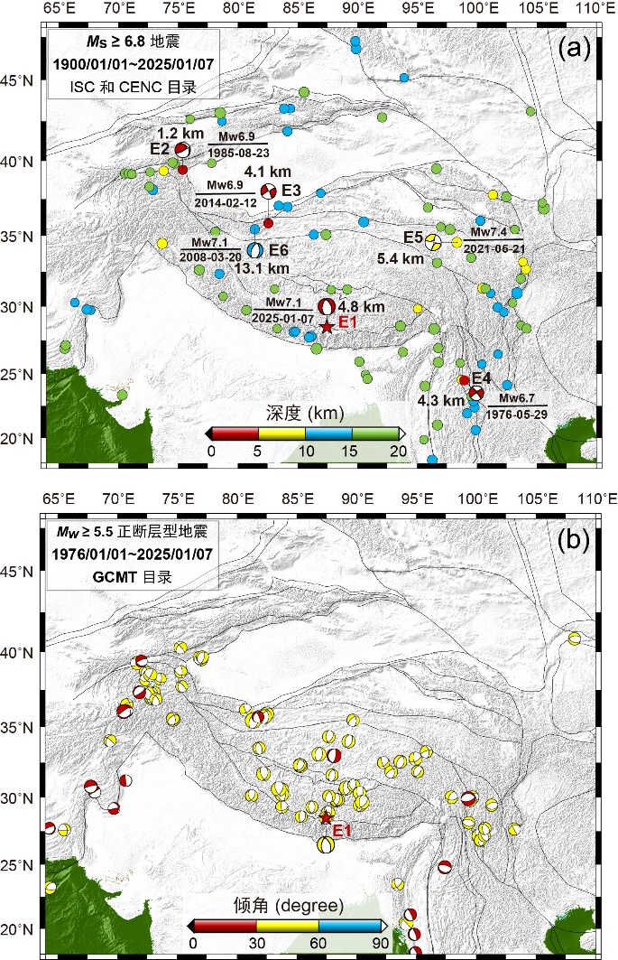 图2 青藏高原历史地震深度与倾角分布图。(a) Ms ≥ 6.8地震深度分布,圆圈颜色代表深度;(b) Mw ≥ 5.5正断层型地震的倾角分布,震源球颜色代表倾角。图中E1代表本次定日地震