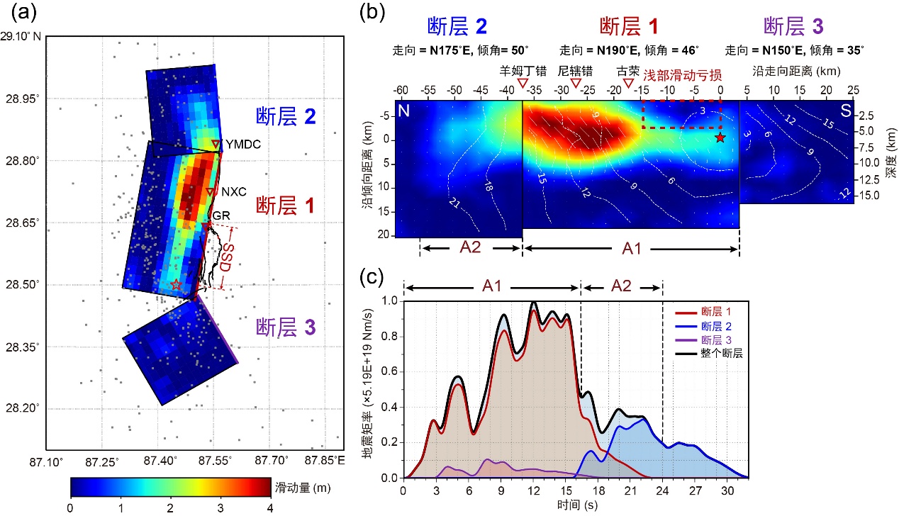 联合反演结果显示(图3),定日地震破裂总体呈北向单侧扩展,持续时间约24秒,释放的地震矩约5.13×10¹⁹ Nm。破裂过程主要涉及三个子断层。其中断层1与断层2贡献约95%的地震矩释放,滑动分布揭示出两个显著凹凸体(asperity),主凹凸体(A1)峰值滑动量约4米。在断层1北端,破裂可能受到构造阻挡,延迟后扩展至断层2,导致破裂持续时间比经验关系预测值延长约25%。这一多断层参与的复杂破裂模式,与野外调查发现的25–30 千米不连续地表破裂及余震分布相一致。