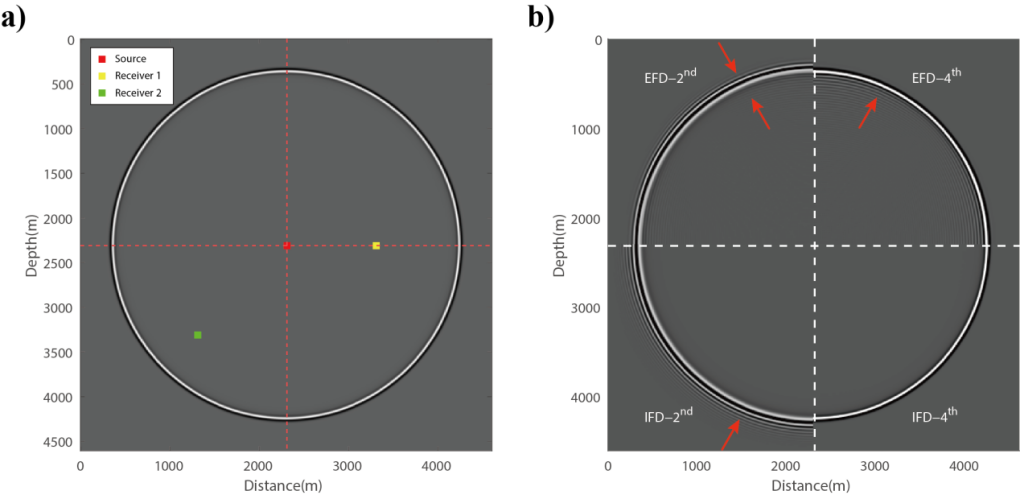 图1 均匀介质模型中的波场快照。(a)震源与接收点在模型中的空间分布示意图;(b)四种方法模拟的波形频散对比。左上为空间显式8阶-时间2阶差分格式;右上为空间显式8阶-时间4阶差分格式;左下为空间隐式/时间2阶差分格式。右下为空间隐式/时间4阶有限差分格式
