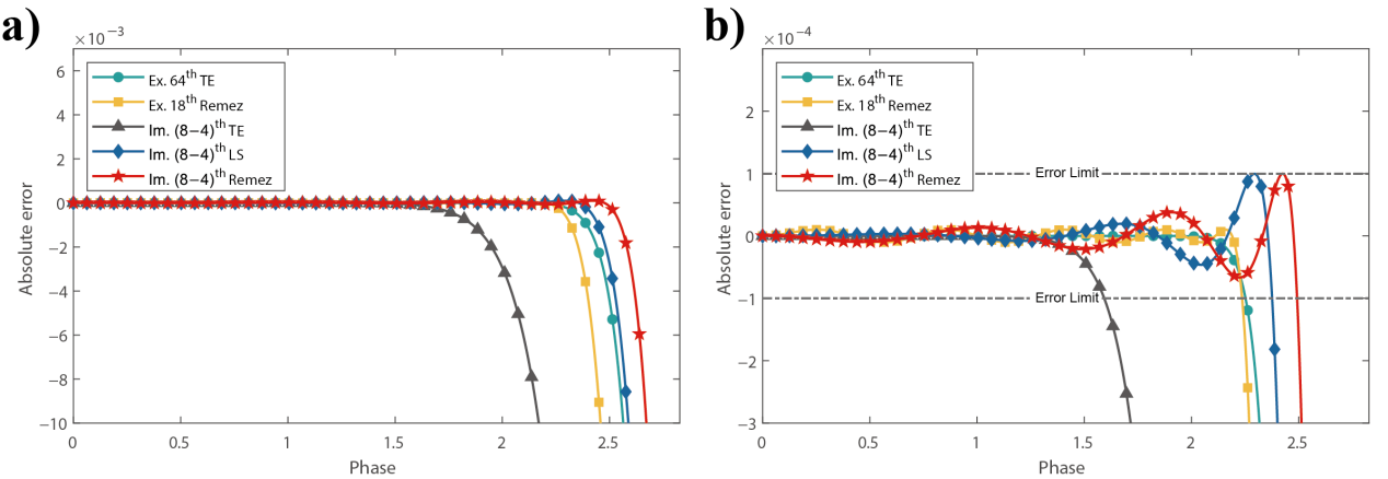 为了提高地震波正演模拟的精度和效率,800彩票博士研究生高张永瑞在张振东研究员和刘伊克研究员的指导下,提出了一种具有最优系数的空间隐式时间显式高阶有限差分新格式。该方法采用Z变换推导高阶空间导数的隐式差分形式,结合因果-反因果积分法进行空间隐式差分计算,在避免额外内存消耗的前提下,以1/3的计算成本,达到了等同于空间显式64阶差分等效精度;同时以时间高阶差分替代二阶差分计算时间偏导数,进一步提高了正演模拟的时间精度和稳定性,图1展示了即使在单个波长内仅有两个采样点的前提下,新方法提出的空间差分和时间差分格式分别在压制空间频散和时间频散时的有效性。差分系数由Remez Exchange算法求出,对比传统泰勒展开和最小二乘优化算法,该差分系数计算出的波数精度更高,这一结论充分体现在图2中的高波数区。